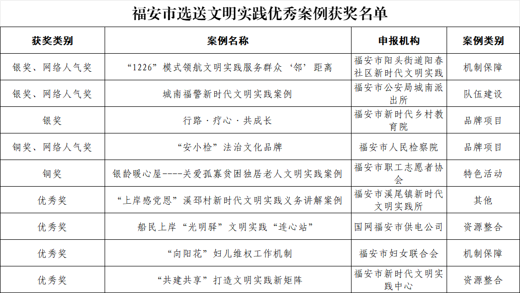 11月12日,由中共宁德市委宣传部(文明办)主办,中共蕉城区委宣传部(文明办)承办的宁德市第二届新时代文明实践优秀案例展示交流活动(决赛)在蕉城区举行,历经初赛153支队伍的激烈角逐与网络投票,来自全市各地的46个文明实践案例代表齐聚一堂,同台展示文明实践案例的创新成果与实践智慧。其中,福安市推送的9个文明实践优秀案例喜获大赛3个银奖、2个铜奖、4个优秀奖,同时,3个获奖案例同步获评“网络人气奖”。