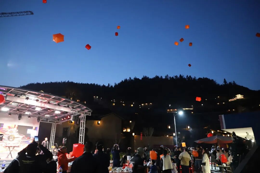 在围炉夜宴活动中,发放电子孔明灯,游客们写下心愿,共同放飞,孔明灯寄托着新春期许飘向远方。