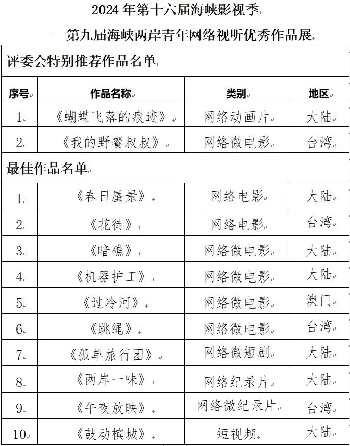杨国瑞指出,过去一年,两岸视听领域交流合作克服障碍与阻隔,取得新进展、呈现新气象,众多优秀视听作品在两岸播出凝聚两岸民心,举办多种形式的业界和青年活动深化交流交往,出台广电视听领域重大惠台政策措施促进两岸产业融合发展。他提出,两岸业者应坚定站在历史正确的一边,坚守媒体职责使命,呼吁各界坚持体现一个中国原则的“九二共识”,坚决反对“台独”和外部势力干涉,坚定守护中华民族共同家园,携手创作更多展现中华文化魅力的视听作品,共同弘扬中华文化,抓住发展机遇,不断汇聚两岸产业融合发展力量。张彦表示,影视作为一种当代影响力最大的艺术形式,具有跨越时空、连接心灵的强大能量。期望两岸影视界心手相连、守望相助、相融相亲,进一步以影弘文,把艺术创造力和中华文化价值融合起来,以影视佳作激活中华文化生命力;进一步以影联心,倾情记录两岸交融交心的温暖瞬间和感人故事,促进两岸同胞心灵契合;进一步以影兴业,以福建探索海峡两岸融合发展新路、建设两岸融合发展示范区为契机,推动两岸影视业先行先试、共享资源、共谋发展。汪威江表示,近几年优秀台湾影视剧作品成绩亮眼,希望大陆影视业者多多了解台剧的觉醒。台湾影视业无论制作水平、叙事功底、故事节奏,还是价值观的提炼等方面都有了长足进步,期盼两岸同仁未来能进一步加深合作交流,创造出更多优秀作品,携手向国际市场进军。国台办、国家广电总局、福建省、厦门市有关部门负责人和台湾主办方负责人、来自两岸的影视协会和企业代表参加晚会。近年来,台湾与大陆的各类影视作品在两岸都收获较好口碑,两岸影视产业交流合作不断深化。两岸同胞同文同种,新老作品在两岸观众中都容易产生较强的共情共鸣。本届活动再次启动最受两岸观众欢迎影视作品推选工作,以促两岸影视产业持续繁荣。晚会现场,《追缉》《新白娘子传奇》分获最受大陆观众欢迎的台湾电影、电视剧,《消失的她》《庆余年》分获最受台湾观众欢迎的大陆电影、电视剧,另外电影《怒潮》、电视剧《知否知否应是绿肥红瘦》获评委会特别推荐。晚会紧扣“共创光影新篇章”这一创作主线,舞台以灯光线条打造出鹭岛之滨的海浪流动感,带来沉浸式的观演感受。晚会节目以两岸民族乐器合奏、两岸歌手同唱一首歌、演绎最受台湾观众欢迎的大陆电视剧主题曲等形式,结合南音、民族舞蹈等艺术表现,为两岸观众呈现一场影视盛会。海峡影视季晚会将在东南卫视、海峡卫视、厦门卫视以及优酷、爱奇艺、B站等视频平台播出。第九届海峡两岸青年网络视听优秀作品以“携手向未来”为主题,面向两岸青年从业创作者征集到网络电影、网络微电影、网络纪录片(含网络微纪录片)、网络动画片、短视频、网络微短剧六个单元共1842部作品,征集数量创历届新高,其中台湾地区138部,香港、澳门等地区华人华裔创作者及留学生投稿36部。经评委会评选推荐,确定10部最佳作品和2部评委会特别推荐作品,获表彰作品将于7月在两岸高校、新媒体平台进行展播。本届优秀作品传达了两岸青年对青春奋斗、创新创业、生活审美的思考和感悟,构建了向上向善的共同记忆。本届海峡影视季同期开展两岸观众欢迎的影视作品研讨会、闽台有福影人创作采风行等多项活动,突显了该项活动是两岸影视界重要交流平台的特点。活动期间,东南卫视、海峡卫视、厦门卫视、泉州广播电视台、漳州电视台、龙岩电视台等频道展播《台湾1945》《我的两岸故事》《对渡:一条回家的路》《时隔230年的重逢》《两岸一味》《两岸中医药论坛》《海峡两岸美人茶文化交流活动》《龙台情缘》等多部两岸题材专题电视节目。