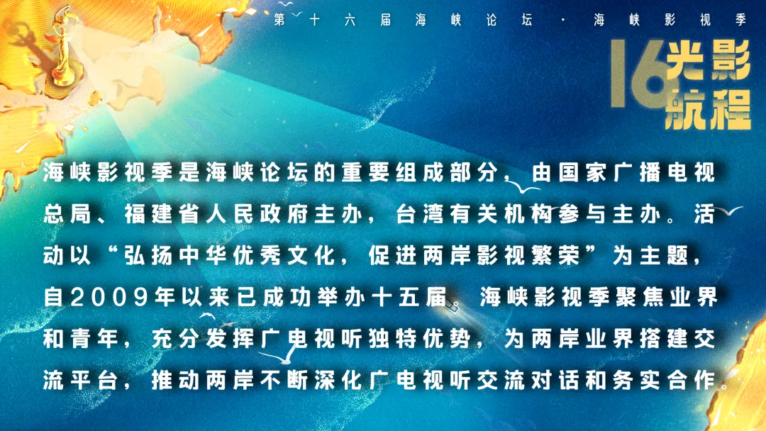 6月14日至15日,由国家广播电视总局、福建省人民政府主办,台湾有关机构参与主办的第十六届海峡论坛·海峡影视季活动在福建厦门如期举行。活动以“弘扬中华优秀文化,促进两岸影视繁荣”为主题,由海峡影视季晚会、海峡两岸青年网络视听优秀作品展、两岸观众欢迎的影视作品研讨会、闽台有福影人创作采风行等多项活动组成,将两岸影视的展示、发展、洽商等融为一体,进一步推动海峡两岸影视精品宣传展示与影视产业合作交流。