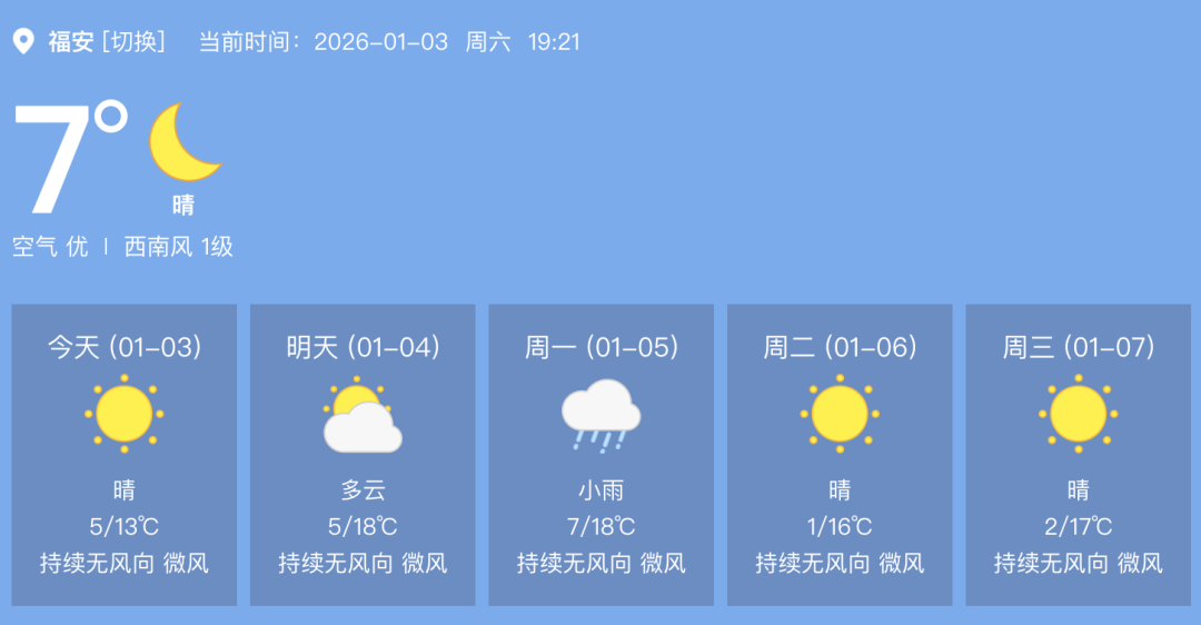 1月4日:晴到多云,有霜或霜冻,高海拔乡镇有结冰。偏北风3级左右,沿海偏北风4~5级,阵风6级。火险3级,易燃危险。气温5~18℃。