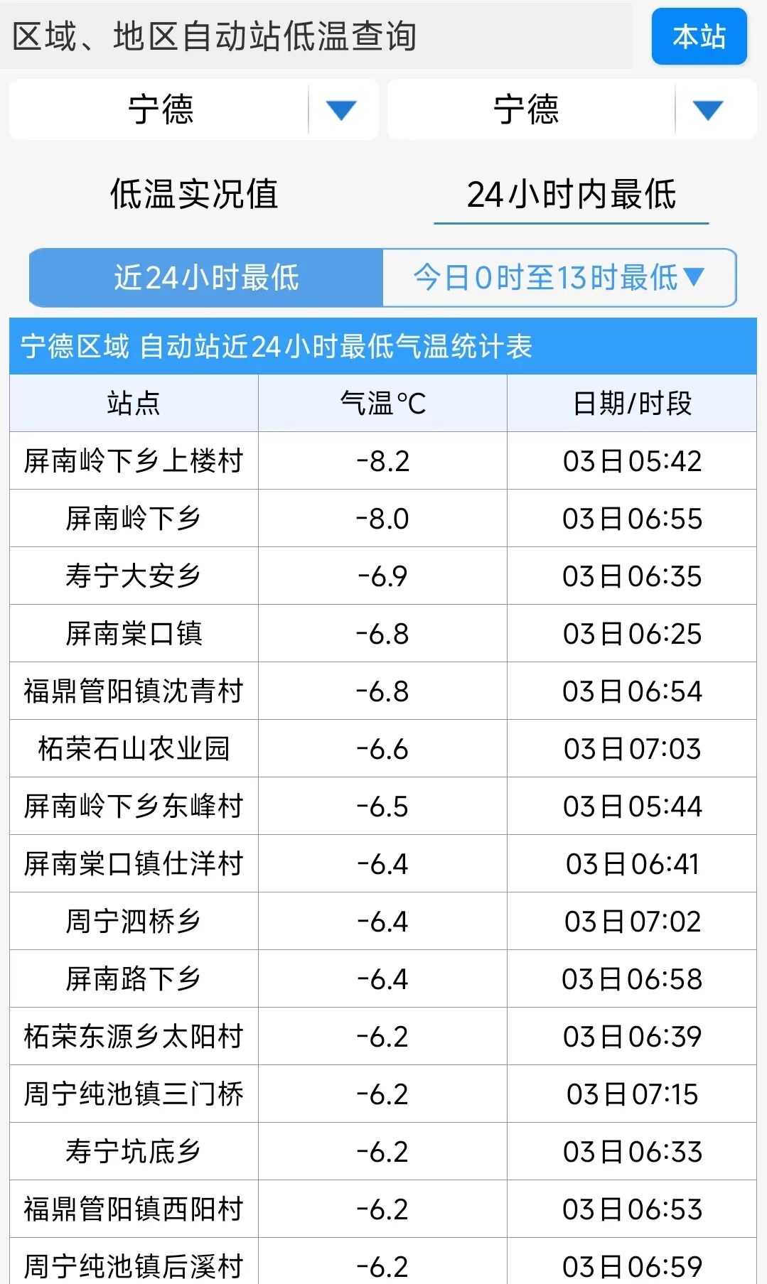 其中,屏南岭下乡出现-8℃低温