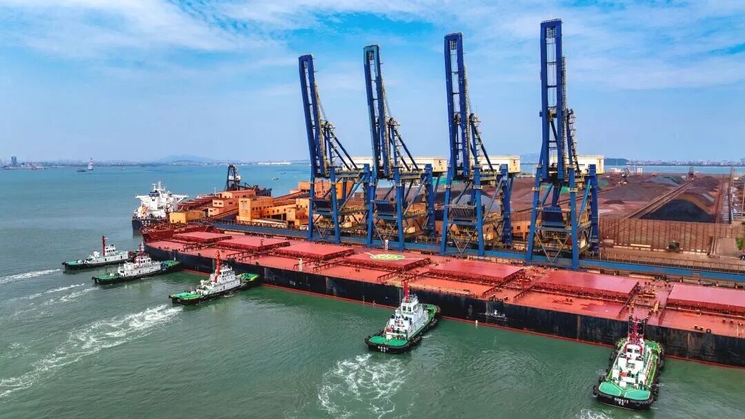 40万吨巨轮满载来自巴西的铁矿石,靠泊莆田港务集团权属罗屿港口进行全卸作业。福建港口集团供图