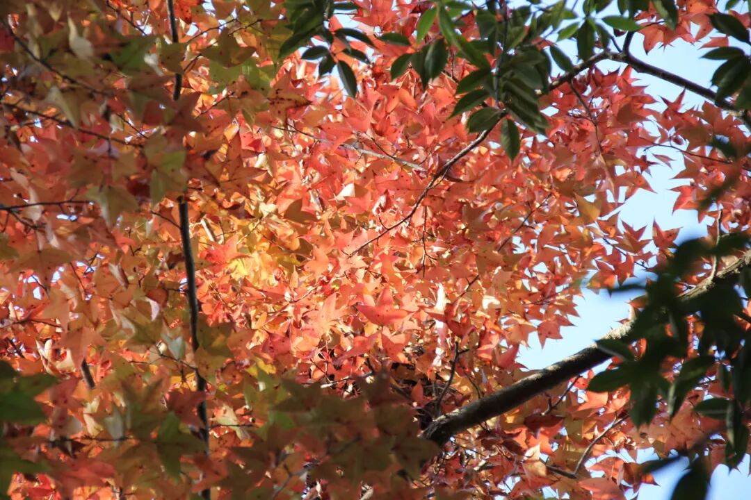 刚走进溪边森林的入口,就被眼前的红枫盛景震撼——数十棵枫树沿溪流两岸密集生长,高大的树干交织成天然拱廊,掌状的叶片在阳光下泛着光泽,浅橙、橘红、深红的色彩渐变错落分布,像被大自然精心调配的调色盘。