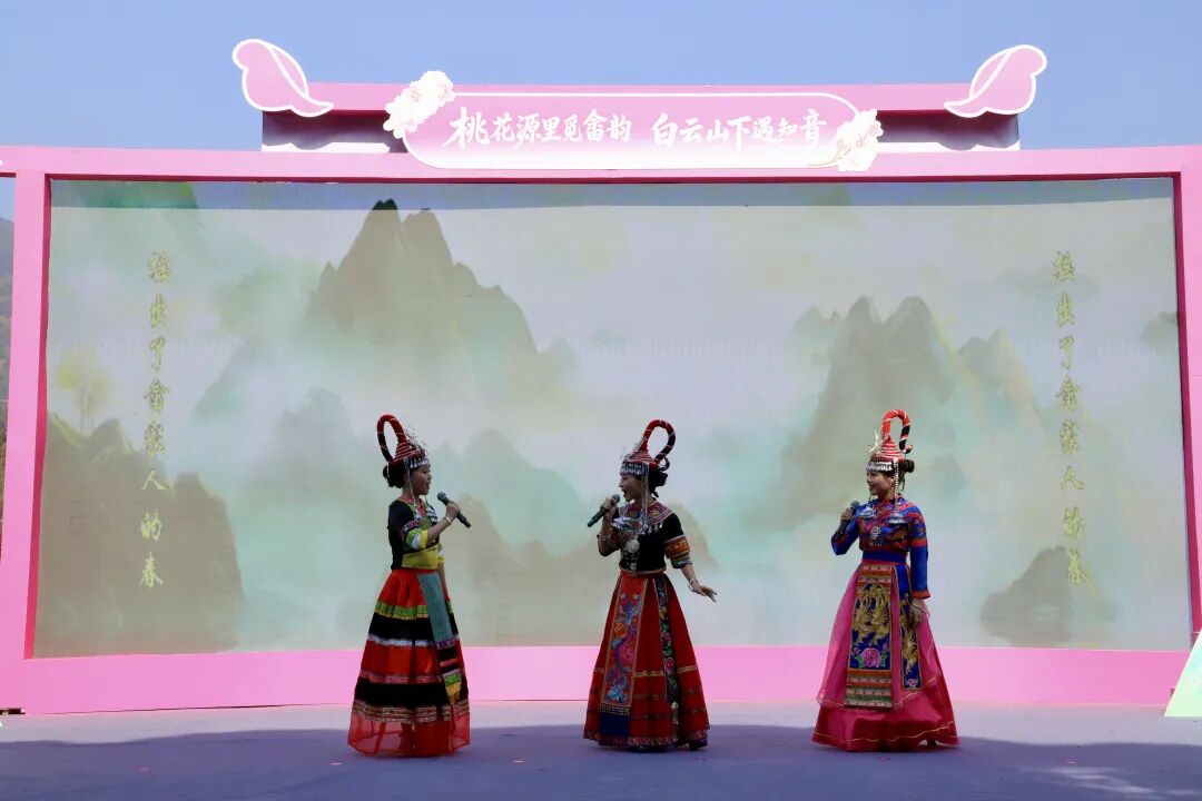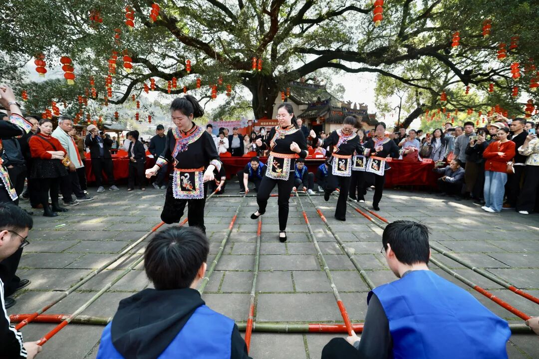 活动现场春意盎然、气氛热烈。开幕式在歌伴舞《在那桃花盛开的地方》中拉开帷幕。随后,畲歌表演《畲家山水谣》唱响畲乡山水情;舞蹈《十里桃花》唯美灵动,勾勒出漫山桃花的醉人景致;平讲戏《皆大欢喜》则以其古朴诙谐的风格赢得了阵阵掌声。此外,器乐表演《赛马》《紫竹调》、歌曲《穆云桃花开》、武术表演《武魂少年》、歌伴舞《家是福安》等节目轮番上演,为观众带来了一场视听盛宴。最后,穆云畲族乡干部带来的互动表演《竹竿舞》更是将现场气氛推向高潮,让游客近距离体验畲族民俗的魅力。