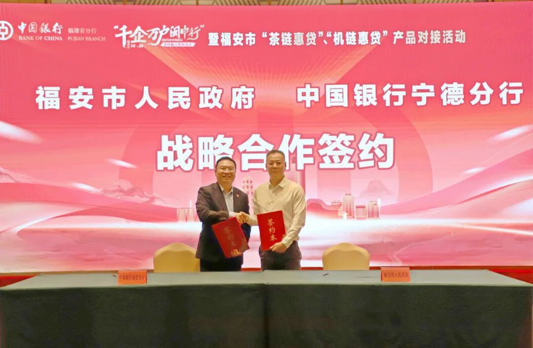 活动上,福安市人民政府与中国银行宁德分行签署战略合作协议。根据战略合作协议,中国银行宁德分行将全力支持福安市经济建设,落实金融服务福安市主要工业园区和乡村振兴支柱产业的快速发展,重点支持福安市不锈钢新材料、新能源产业、电机电器(按摩器具)、坦洋工夫红茶等重点产业的授信需求。