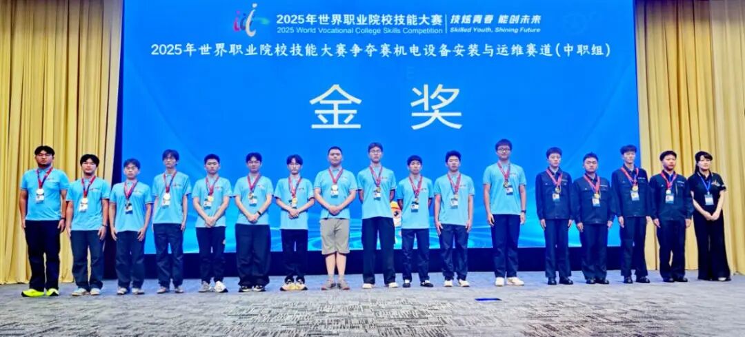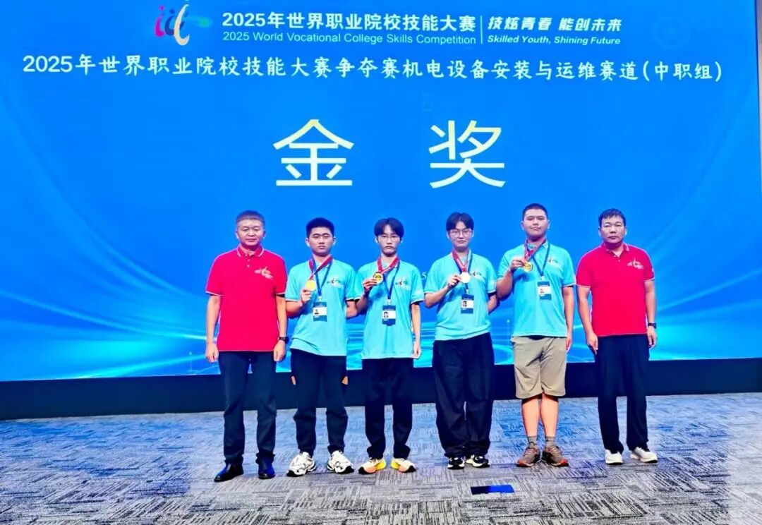 9月12日至18日,2025年世界职业院校技能大赛总决赛争夺赛在天津成功举行。来自全国30多个省份70多支代表队300余名选手同台竞技,竞争激烈。在福安职业技术学校的刘凯和谢方军老师的指导和关心下,许佳修、李浩、赖誉铭、张鸿江四位同学组成的代表队,展现出良好的综合素质和扎实的专业素养,经过激烈角逐,最终脱颖而出斩获中职组“机电设备安装与运维”赛道总决赛金奖,实现了学校在世界职业院校技能大赛金奖零的突破,创造了新的历史!