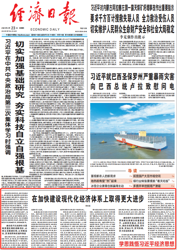 《经济日报》2月23日在头版刊发福建省委书记、省人大常委会主任周祖翼署名文章——《在加快建设现代化经济体系上取得更大进步》,全文如下: