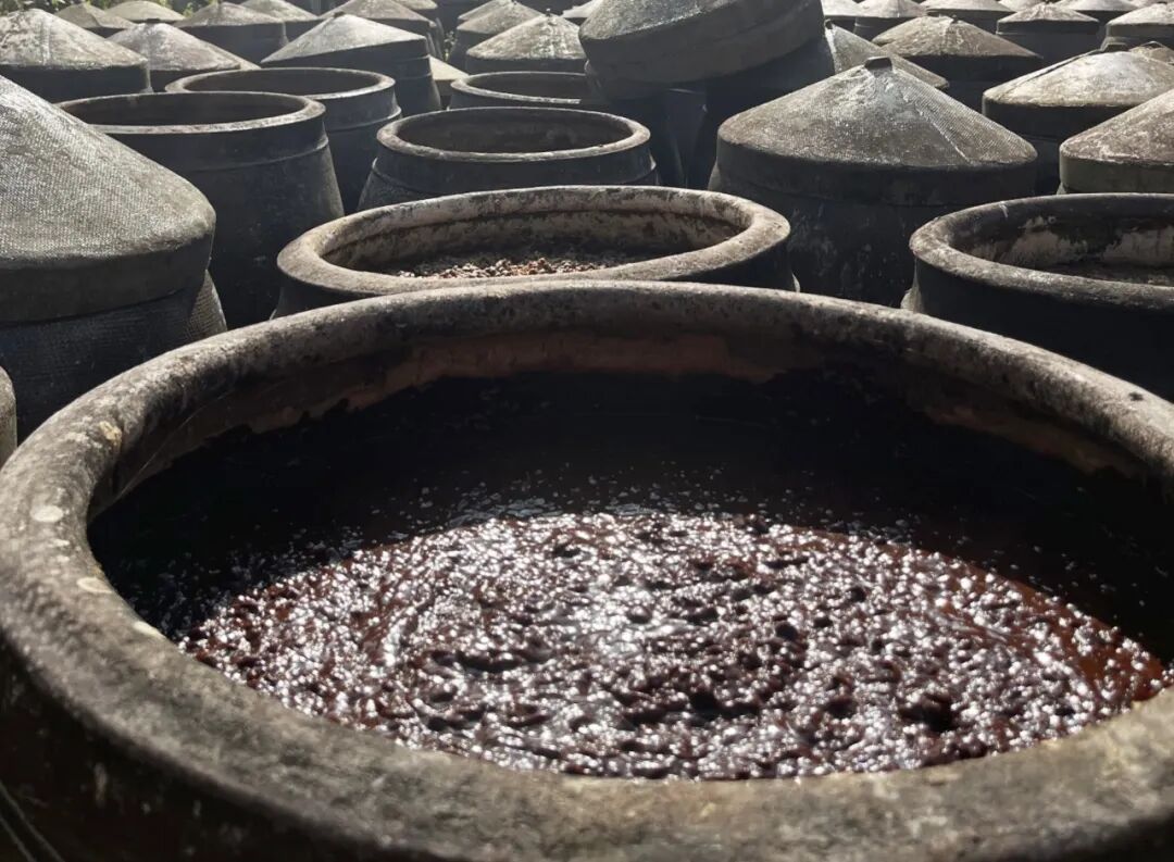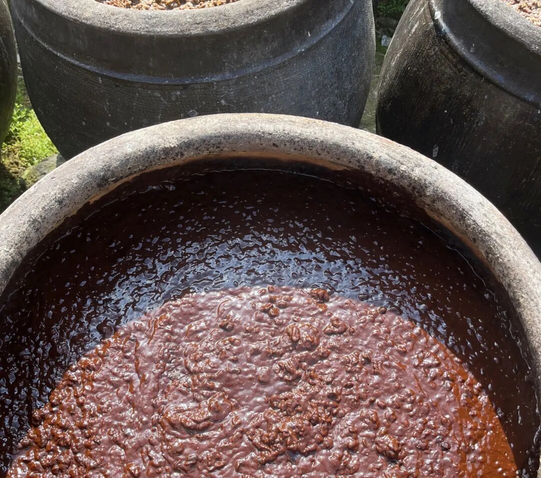 酱油厂阿姨:“这一步是制曲完成后,我们把酱醪放入露天大缸,进行日晒夜露发酵。经过了一段时间发酵,酱醪颜色就变成这样的深红褐色了。后面还会定期进行翻酱,让酱醪受热、接触空气更均匀,这个过程通常要持续3个月以上。然后再进入压榨取油、沉淀灭菌的环节。”