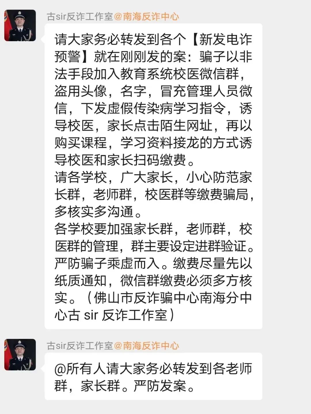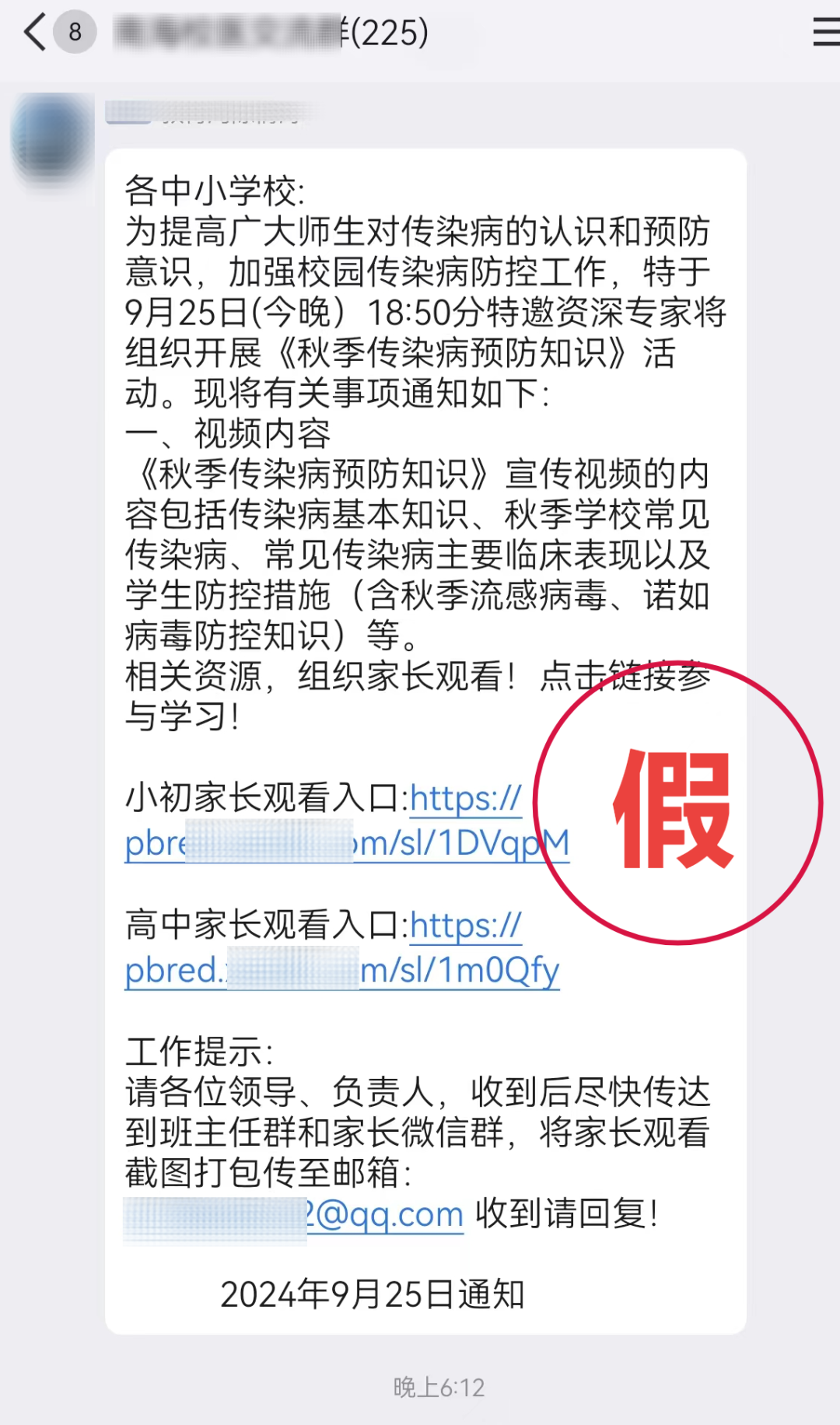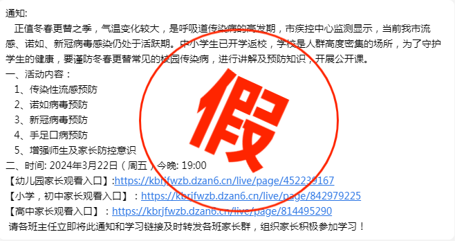 近日,一则关于所谓观看“秋季传染病预防知识课程”的信息在某区各大学校群、班级群被转发,该消息的发布时间临近开课,且其格式与学校平常所发通知相似,并要求“收集家长们观看的截图并发邮箱”,具有较强迷惑性,导致有10余名家长、学校工作人员根据指引扫描二维码购买“优惠学习课程”,从而被骗。幸好部分老师和家长具备了充分的反诈骗意识与高度的警惕性,看到要求点击陌生网址或进行扫码支付的情况时,他们立即向某市反诈骗中心的民警咨询,从而避免了上当受骗。紧接着,反诈骗民警第一时间在群里发布电诈预警,阻止更多人上当受骗。事实上,“虚假通知”骗局并不新鲜,多地已发生过。骗子先是以非法手段加入群聊,查看群内管理员的头像、昵称等信息后,快速创建高仿账号。接着,利用老师、家长对孩子教育、健康的关切心理,发布观看“传染病防控知识公开课”“校园安全教育”等虚假通知,这类虚假的观看通知时间要求紧迫,让师生、家长来不及核实,以提高其诈骗成功率。最后,诱导师生及家长点击陌生网址,再以“限时折扣”等理由,诱导市民扫码缴费购买课程骗取钱财。1.学校、老师要加强对群聊的管理,群主应设定进群验证,防止骗子钻空子。缴费尽量以纸质通知为准,同时要多核实、多沟通,不给骗子可乘之机。2.老师、家长要提高警惕、保持清醒、注意甄别,不点陌生网址、不扫描陌生二维码。