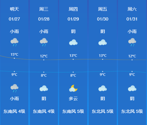 1月27日:阴有小雨。偏北风2~3级,沿海偏北风4~5级,阵风6级。火险2级,可燃。气温10~16℃。