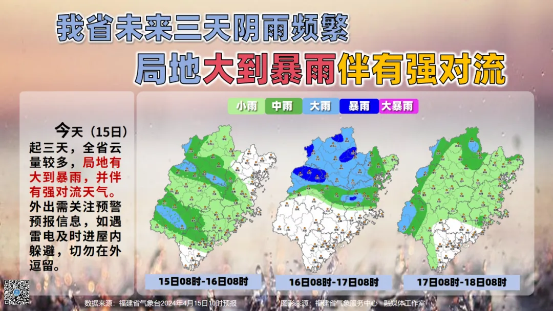 预计15日至17日, 江南、江汉、华南北部及四川盆地东部、贵州中东部等地有中到大雨,局地暴雨或大暴雨,并伴有短时强降水、雷暴大风或冰雹等强对流天气。