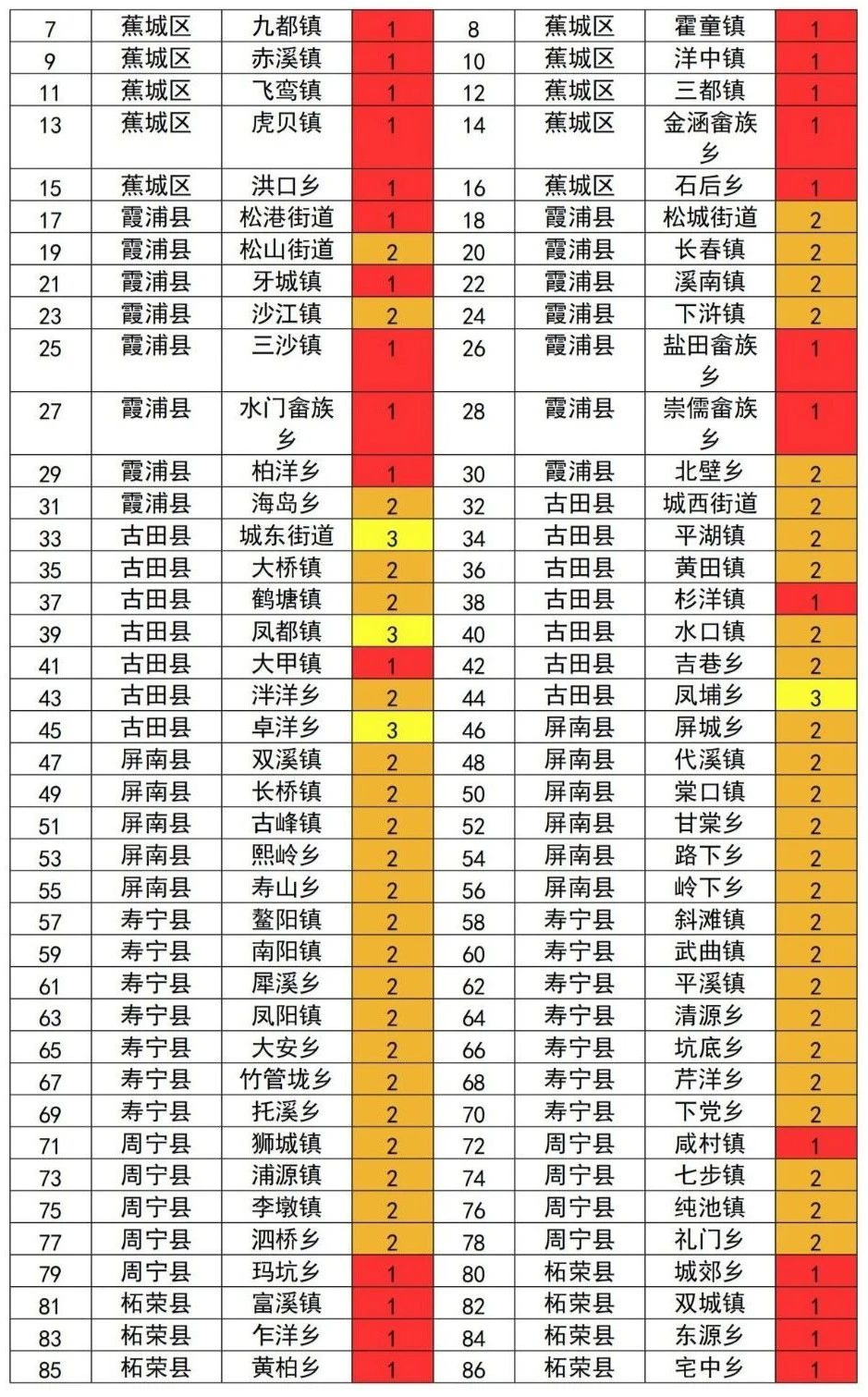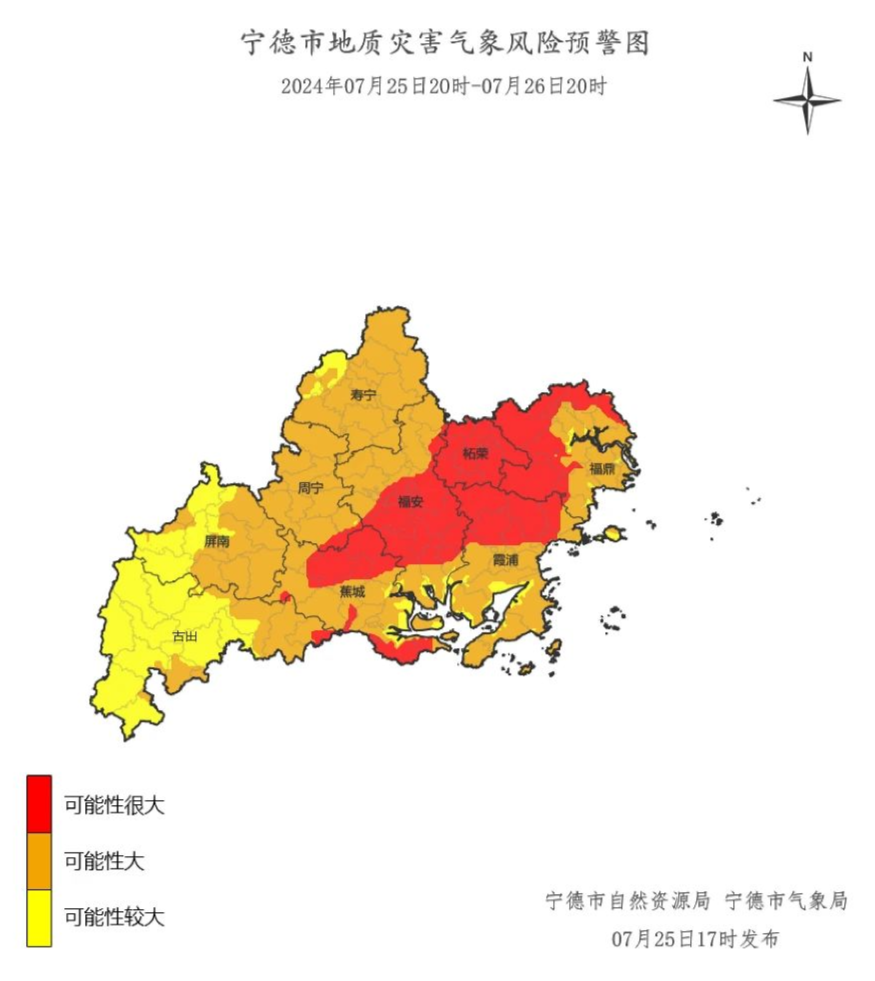 其中,红色预警涉及蕉城区、霞浦县、古田县、周宁县、柘荣县、福安市、福鼎市共7个县,65个乡镇,601个村。预计,7月25日20时至7月26日20时,地质灾害发生可能性很大。各地要在县政府的领导下,结合本地区雨情预报情况,提前转移隐患点、房前屋后高陡边坡、山边河边等地质灾害危险区内受威胁群众。