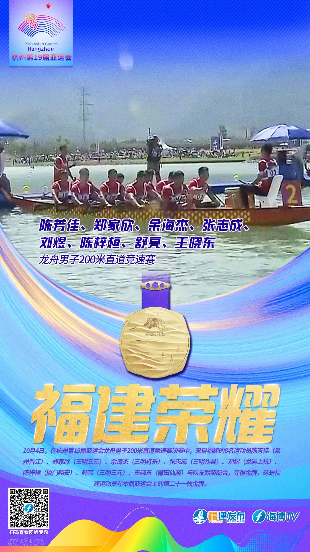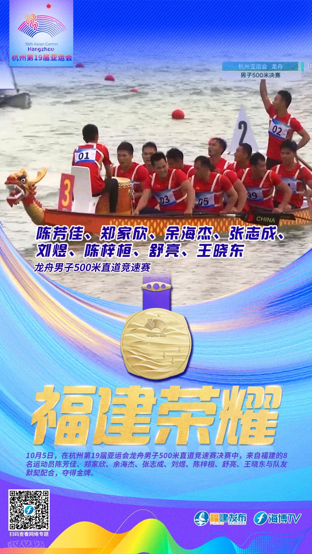 10月5日,在杭州第19届亚运会龙舟男子500米直道竞速赛决赛中,来自福建的8名运动员陈芳佳、郑家欣、余海杰、张志成、刘煜、陈梓桓、舒亮、王晓东与队友默契配合,夺得金牌。这是福建运动员在本届亚运会上的第二十二枚金牌。