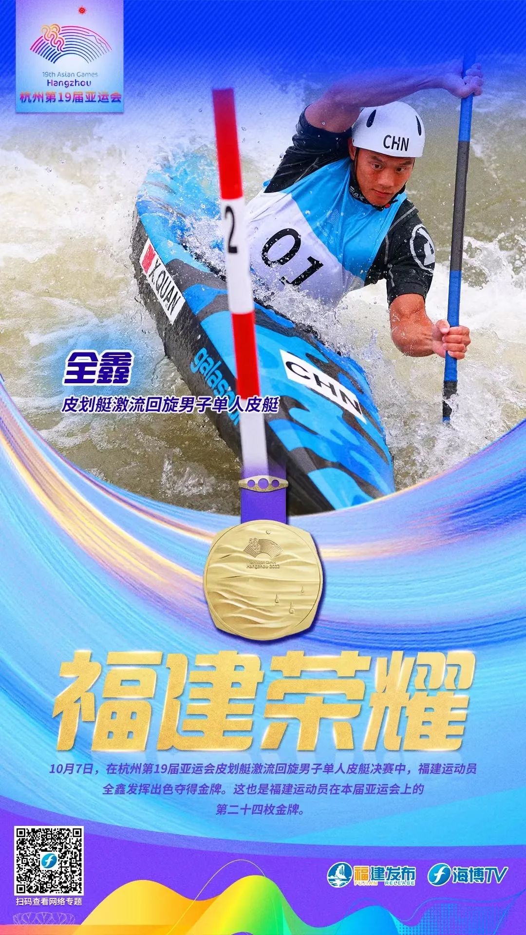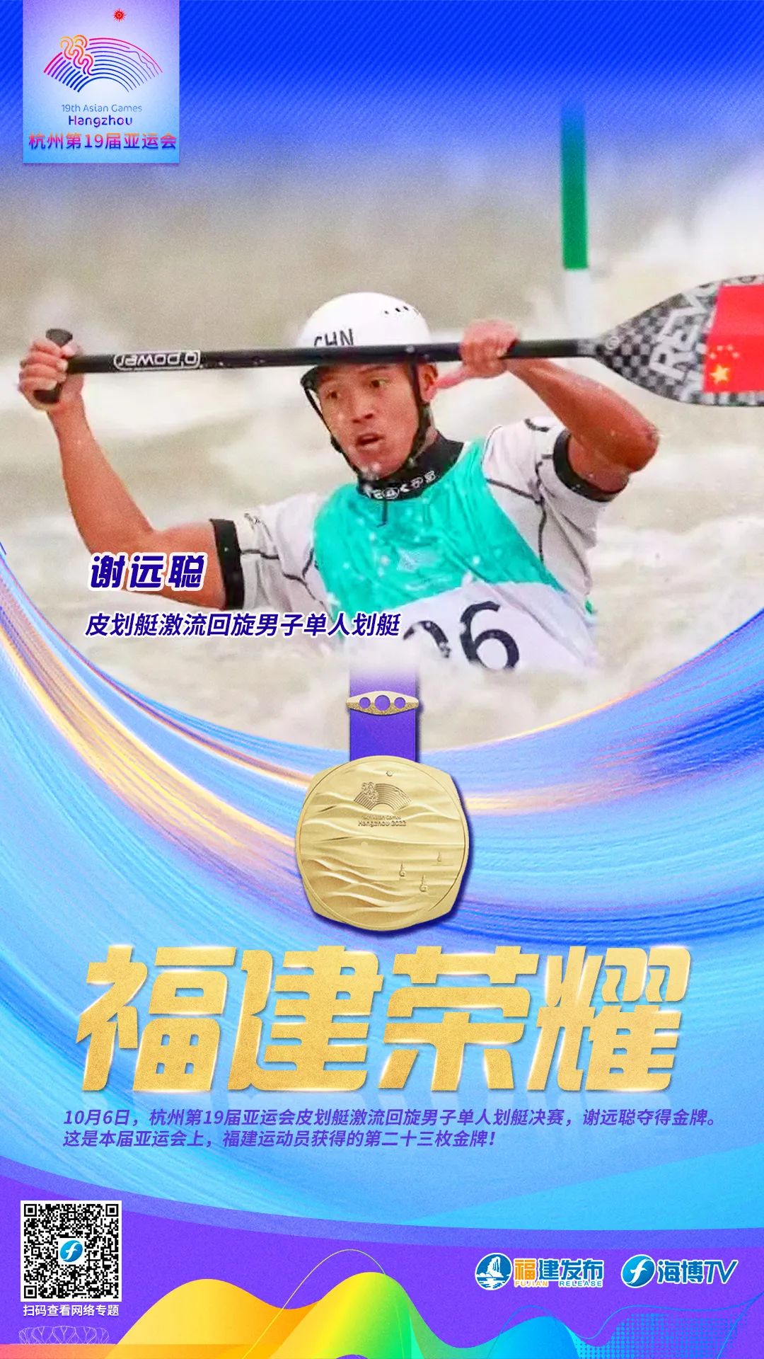 10月6日,在杭州第19届亚运会皮划艇激流回旋男子单人划艇决赛中,福建选手谢远聪夺得金牌。这是本届亚运会上,福建运动员获得的第二十三枚金牌。