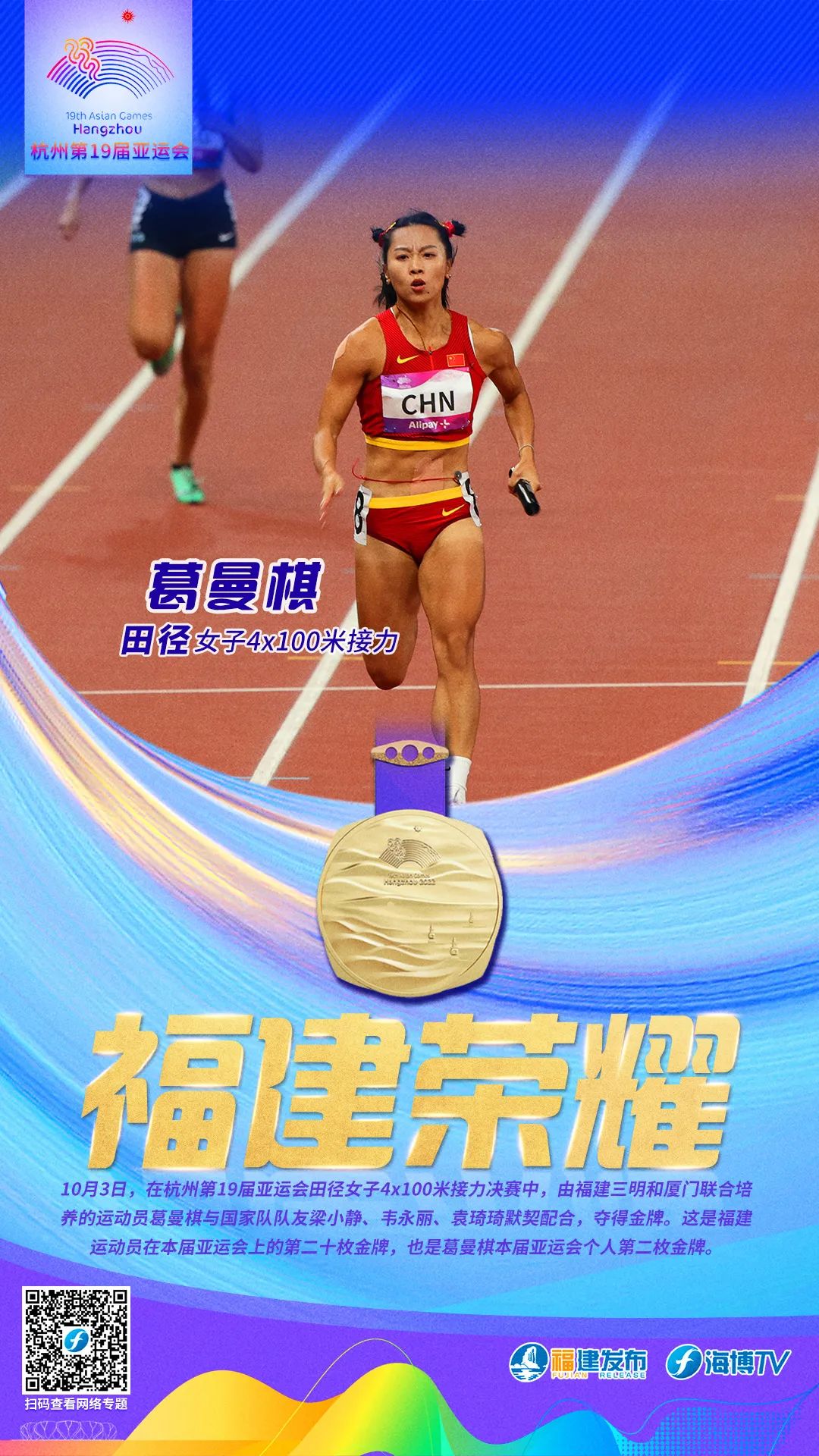 10月3日,在杭州第19届亚运会田径女子4x100米接力决赛中,福建选手葛曼棋与国家队队友梁小静、韦永丽、袁琦琦默契配合,夺得金牌。这是福建运动员在本届亚运会上的第二十枚金牌,也是葛曼棋本届亚运会个人第二枚金牌。
