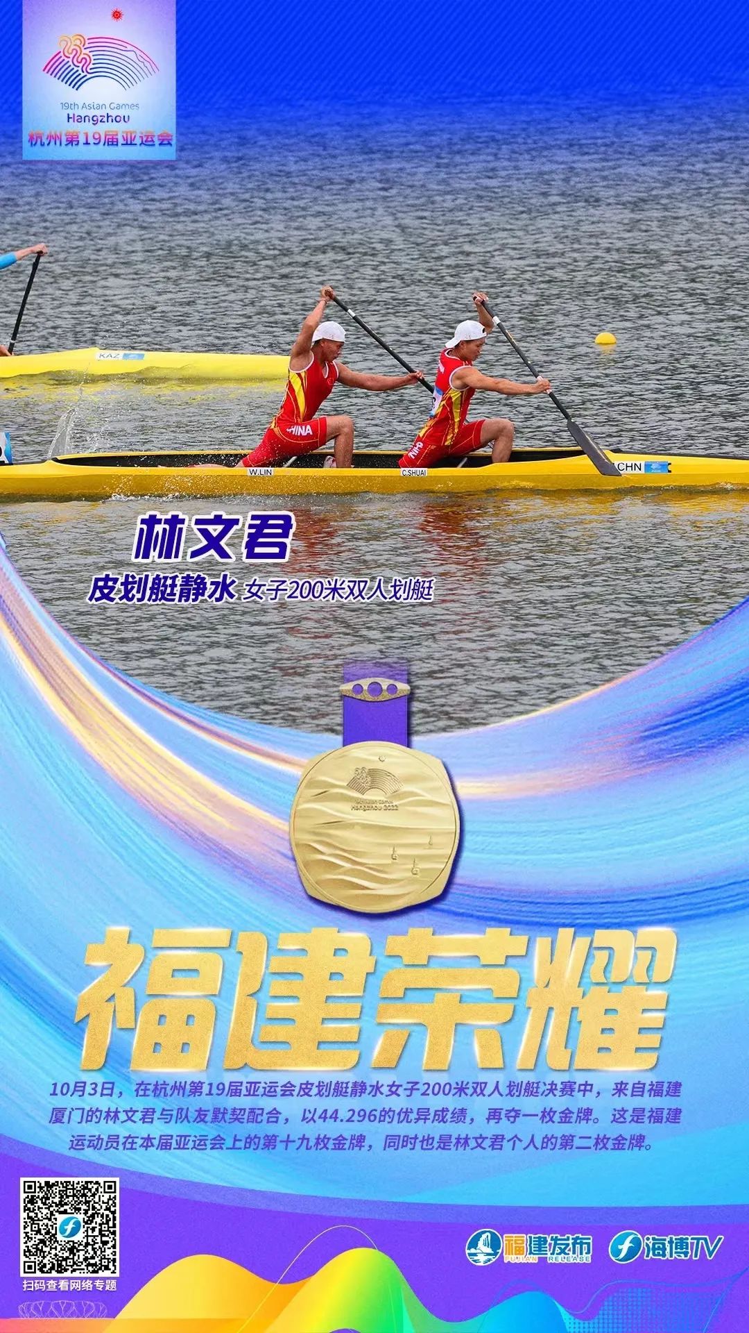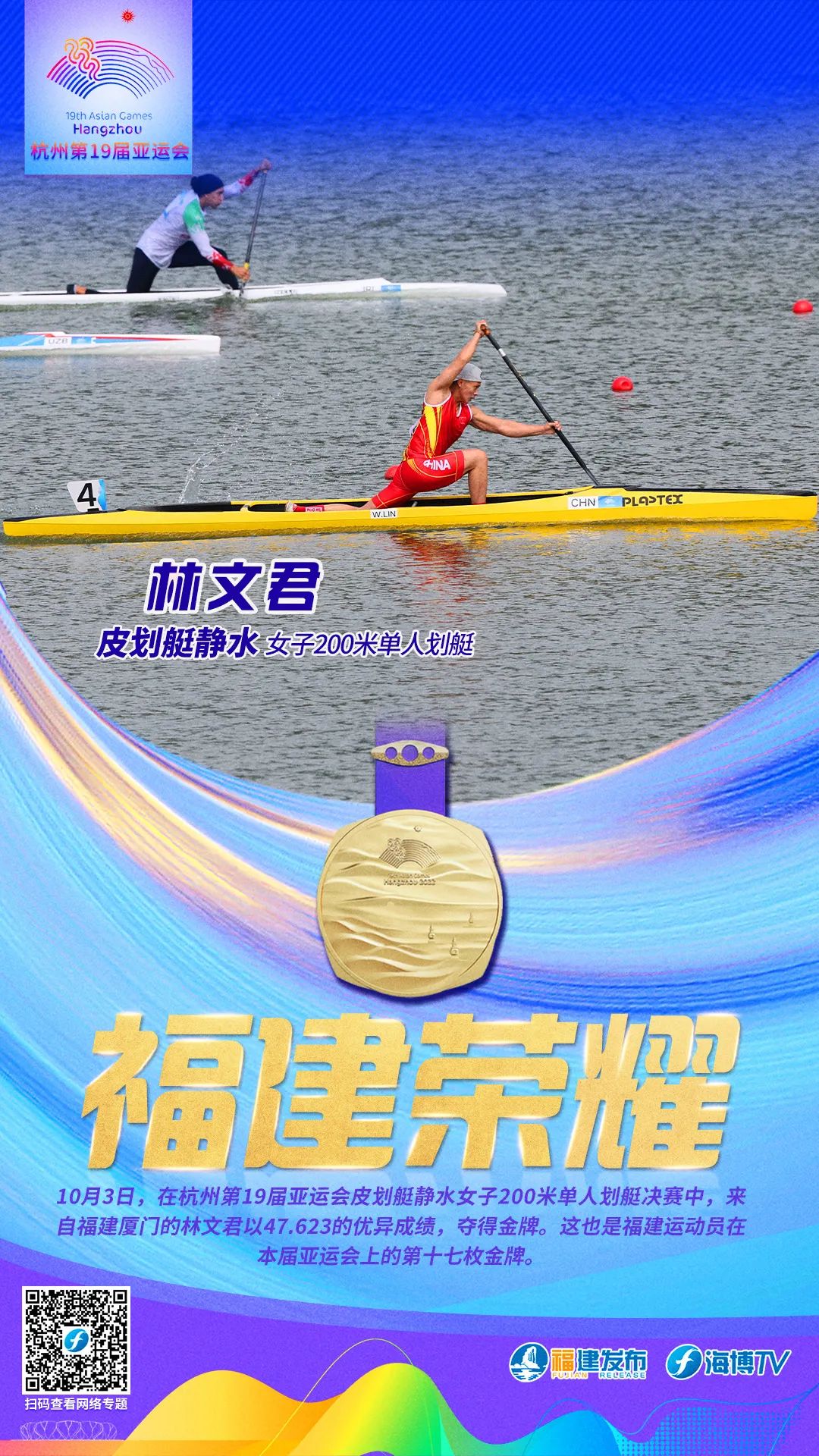 10月3日,在杭州第19届亚运会皮划艇静水女子200米单人划艇决赛中,福建选手林文君以47秒623的优异成绩,夺得金牌。这也是福建运动员在本届亚运会上的第十七枚金牌。