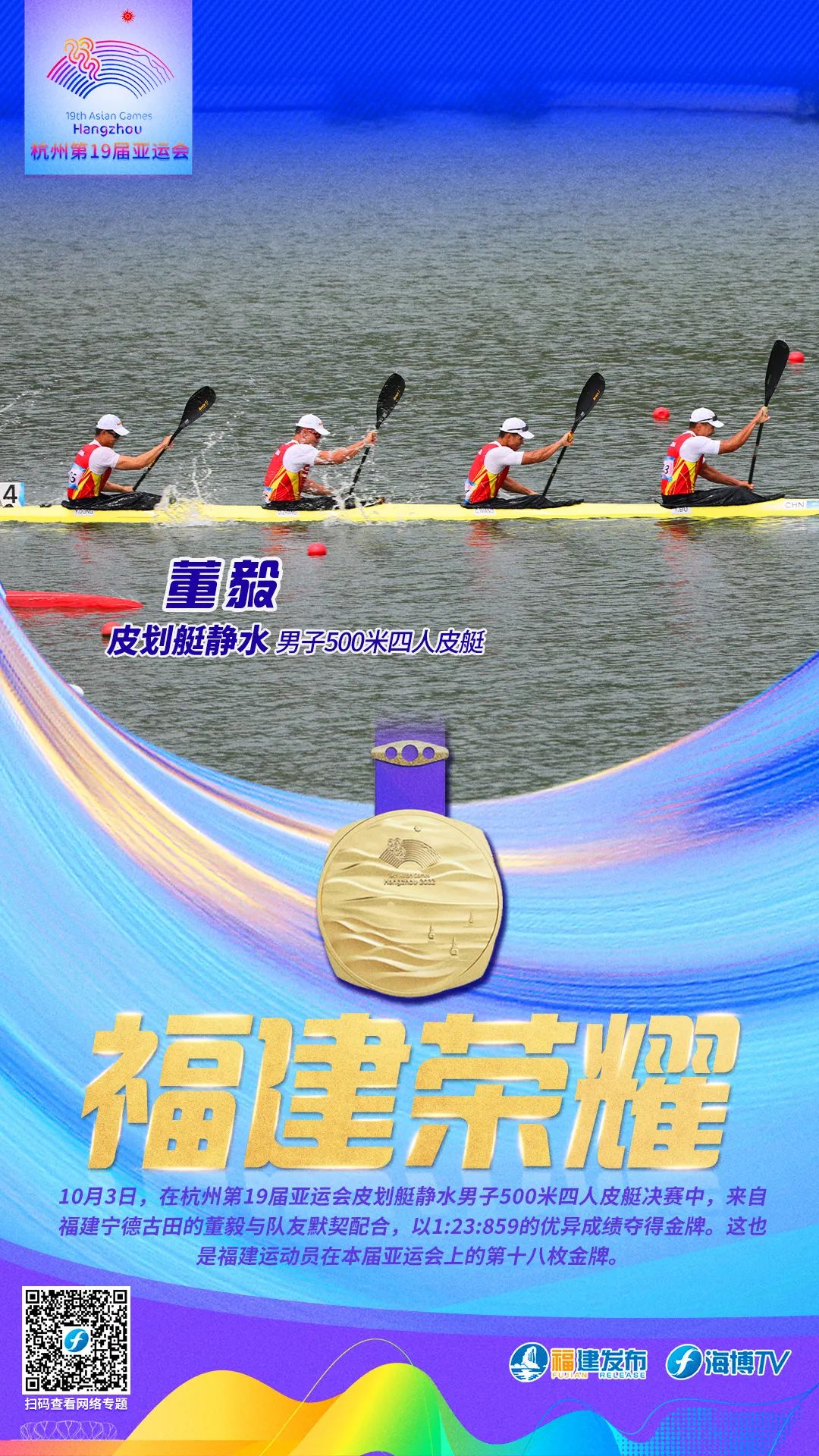 10月3日,在杭州第19届亚运会皮划艇静水男子500米四人皮艇决赛中,福建选手董毅与队友默契配合,以1分23秒859的优异成绩夺得金牌。这也是福建运动员在本届亚运会上的第十八枚金牌。