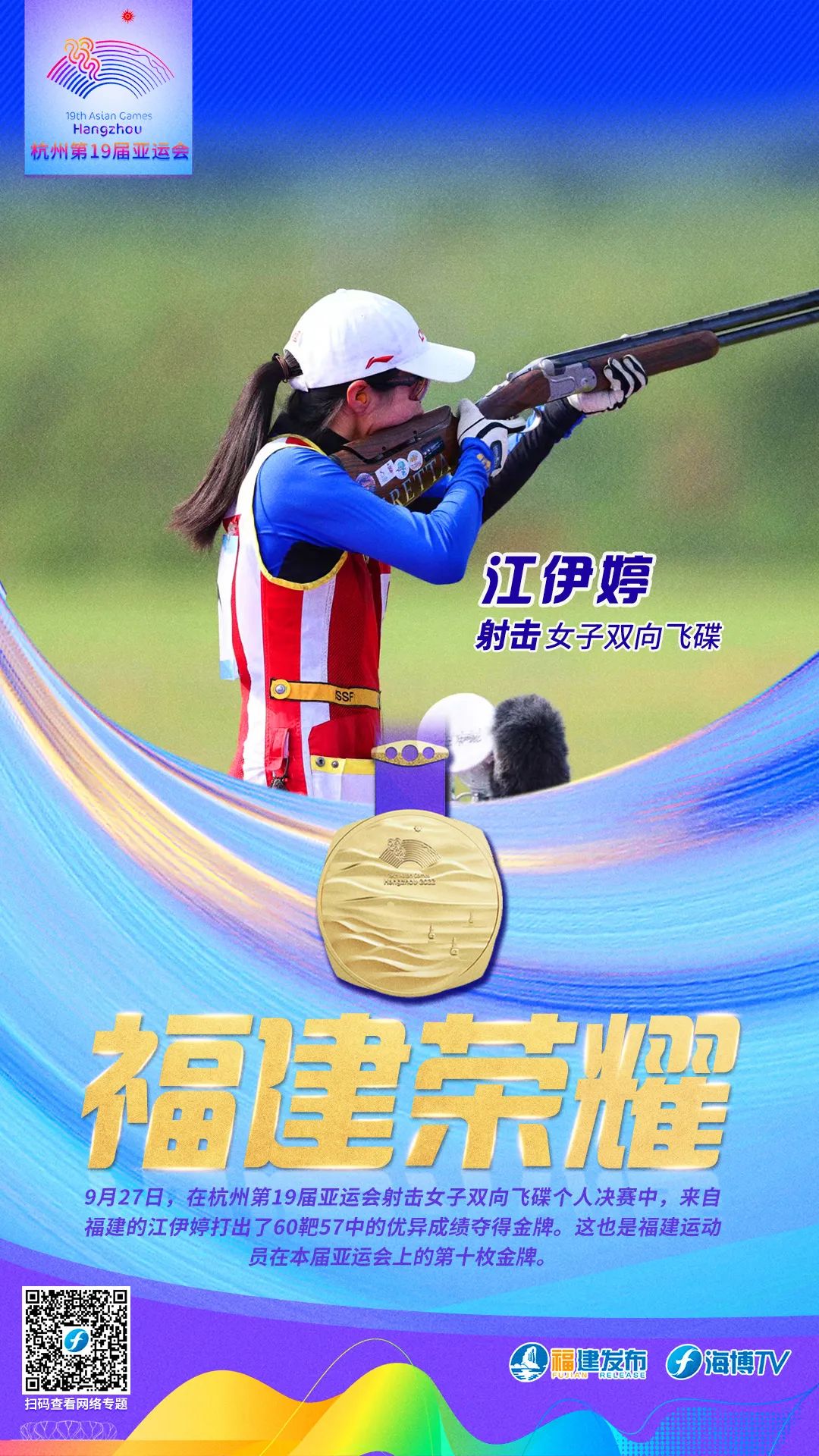 9月27日,在杭州第19届亚运会射击女子双向飞碟个人决赛中,福建选手江伊婷打出了60靶57中的优异成绩夺得金牌。这也是福建运动员在本届亚运会上的第十枚金牌。