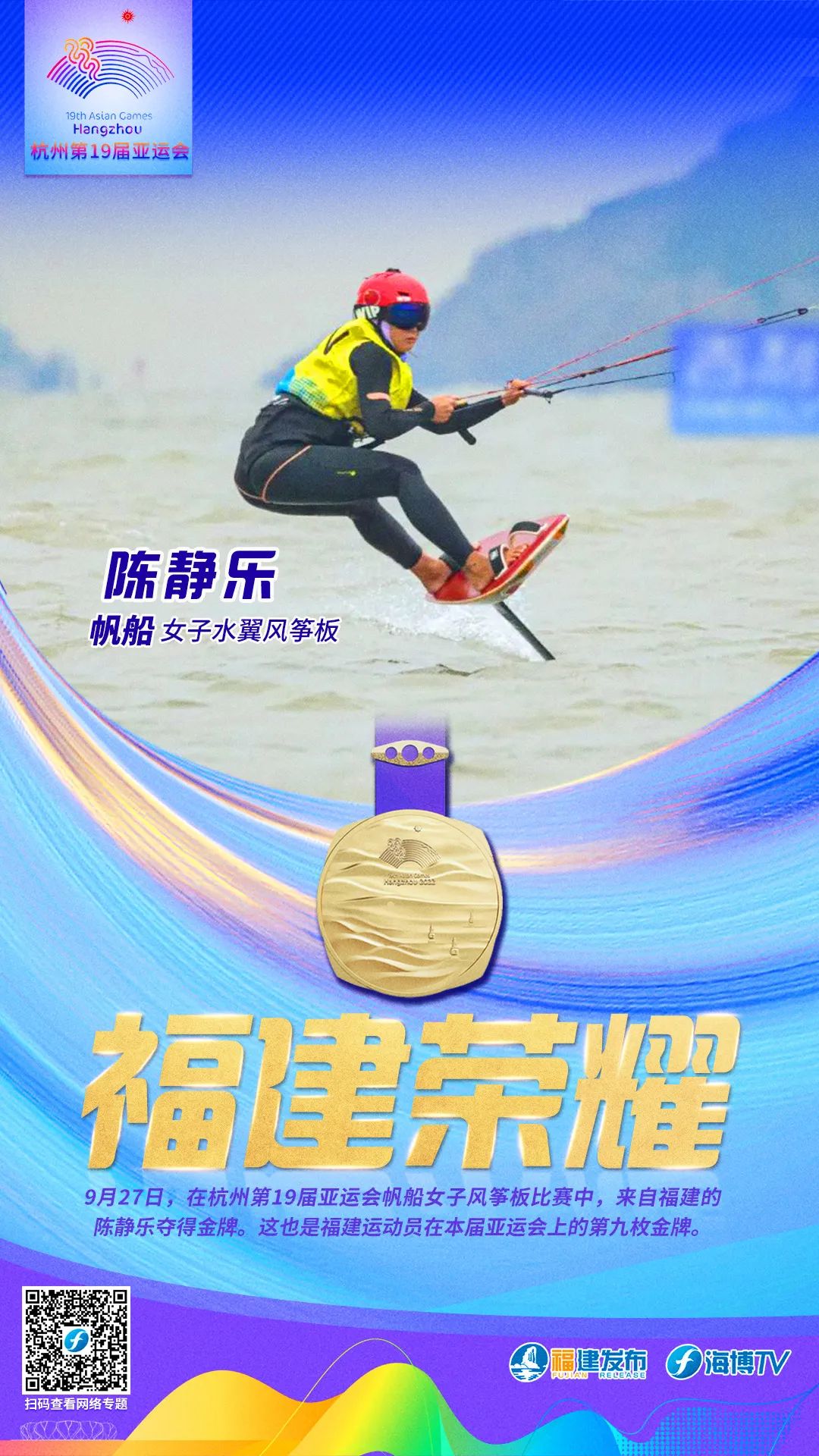 9月27日,在杭州第19届亚运会帆船女子风筝板比赛中,福建选手陈静乐夺得金牌。这也是福建运动员在本届亚运会上的第九枚金牌。