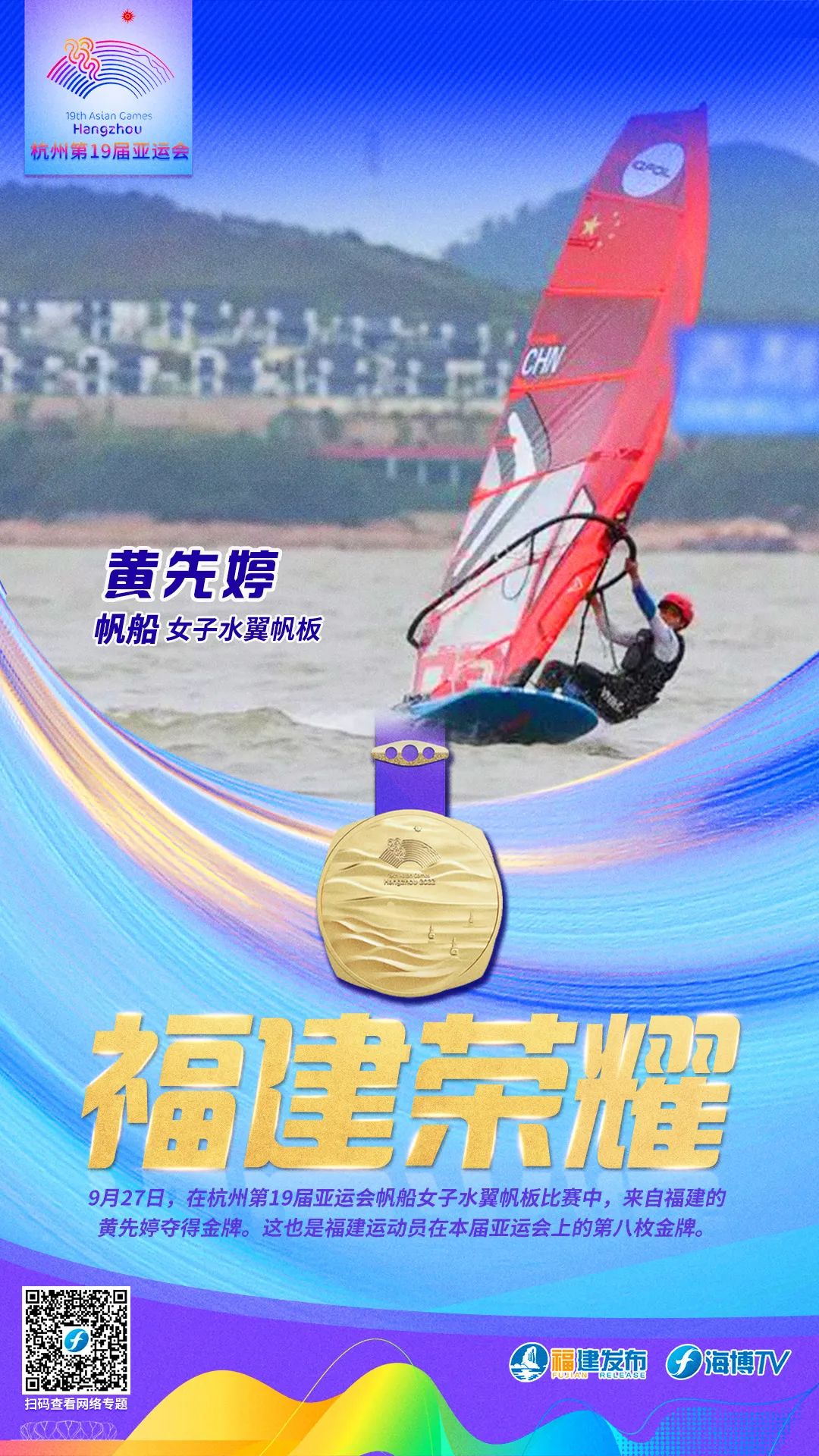 9月27日,在杭州第19届亚运会帆船女子水翼帆板比赛中,福建选手黄先婷夺得金牌。这也是福建运动员在本届亚运会上的第八枚金牌。