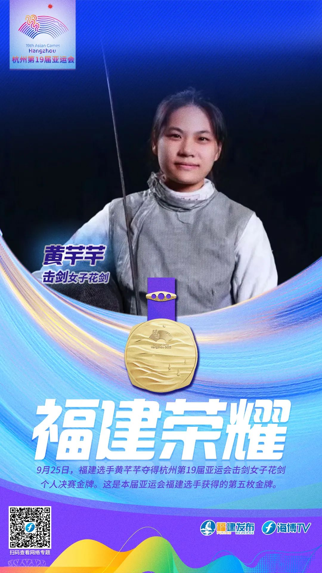 9月25日,福建选手黄芊芊夺得杭州第19届亚运会击剑女子花剑个人决赛金牌。这是本届亚运会福建选手获得的第五枚金牌。
