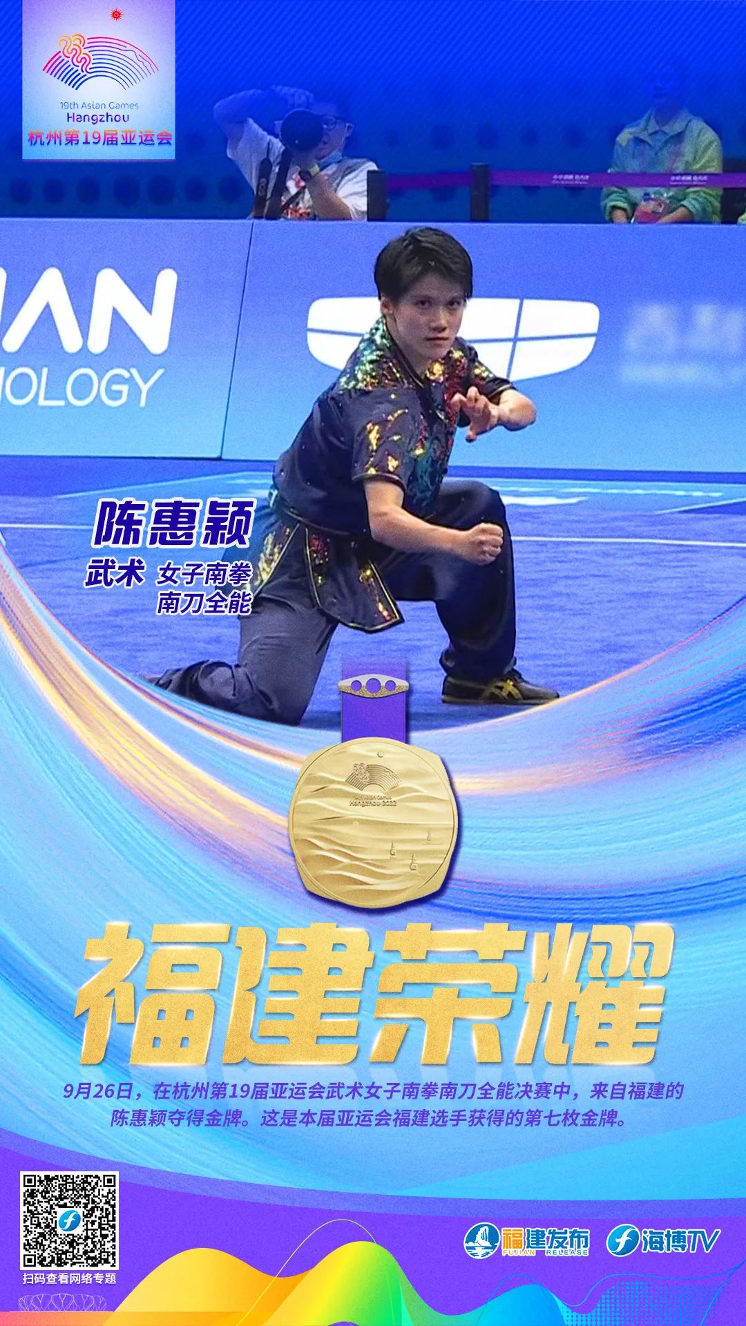 9月26日,在杭州第19届亚运会武术女子南拳南刀全能决赛中,福建选手陈惠颖夺得金牌。这是本届亚运会福建选手获得的第七枚金牌。