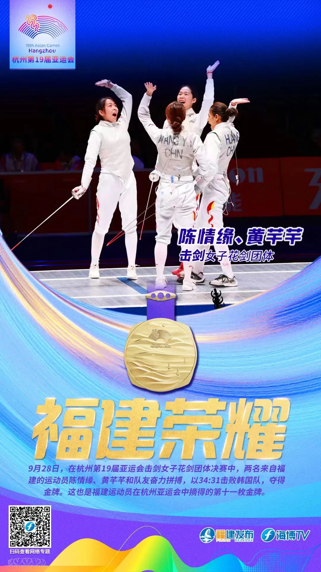 9月28日,在杭州第19届亚运会击剑女子花剑团体决赛中,两名福建选手陈情缘、黄芊芊和队友以34:31击败韩国队,夺得金牌。这也是福建运动员在杭州亚运会中摘得的第十一枚金牌。同时也是黄芊芊本届亚运会个人的第二枚金牌。