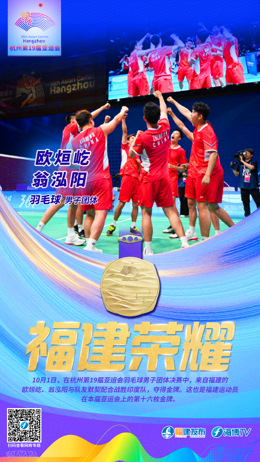 10月1日,在杭州第19届亚运会羽毛球男子团体决赛中,福建选手欧恒屹、翁泓阳与队友默契配合战胜印度队,夺得金牌。这也是福建运动员在本届亚运会上的第十六枚金牌。