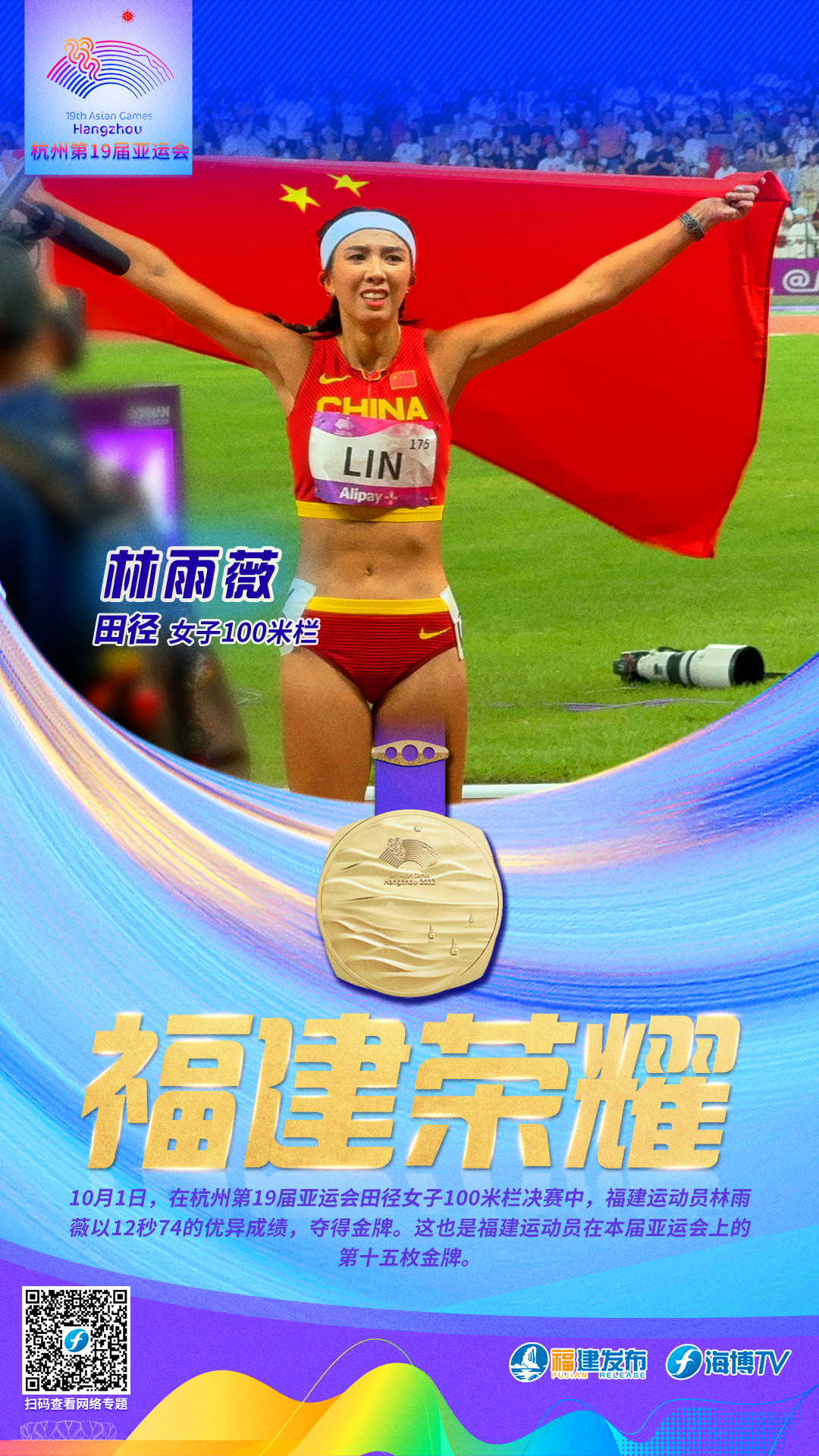 9月30日,在杭州第19届亚运会田径女子100米决赛中,福建选手葛曼棋以11秒23的优异成绩,夺得金牌。这也是福建运动员在本届亚运会上的第十二枚金牌。