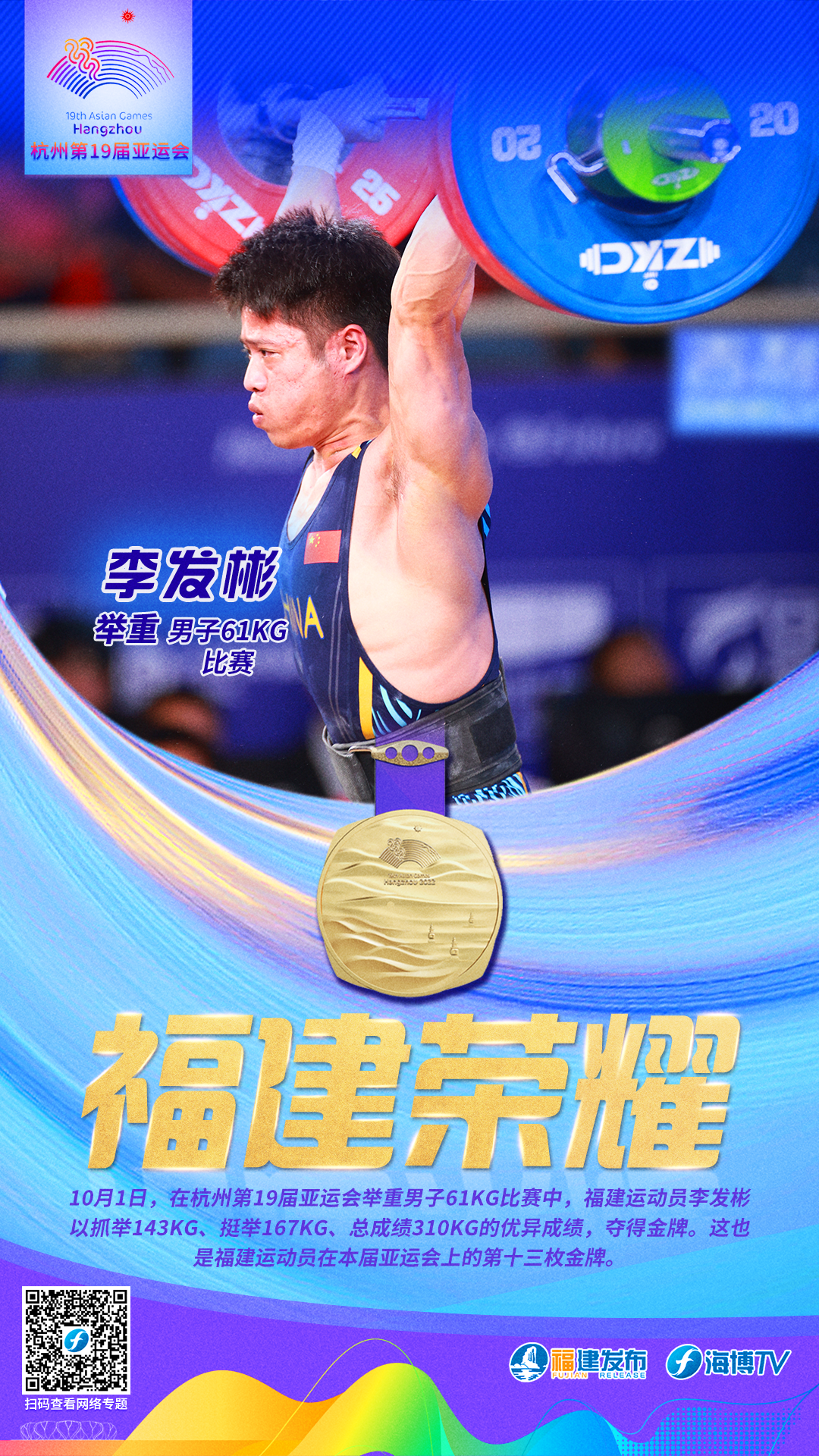 10月1日,在杭州第19届亚运会举重男子61KG比赛中,福建选手李发彬以抓举143KG、挺举167KG、 总成绩310KG的优异成绩,打破该级别抓举、总成绩亚运会纪录,夺得金牌。这也是福建运动员在本届亚运会上的第十三枚金牌。
