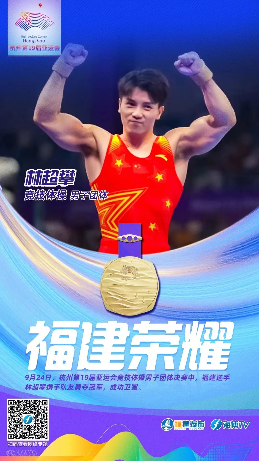 9月24日,在杭州第19届亚运会体操男子团体决赛中,福建选手林超攀与队友张博恒、邹敬园、肖若腾、兰星宇携手成功卫冕。这是福建选手在本届亚运会上夺得的第三枚金牌。