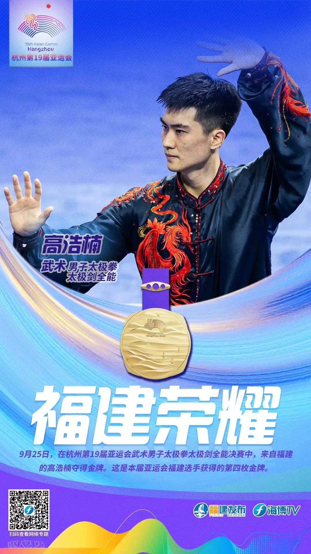 9月25日,在杭州第19届亚运会武术男子太极拳太极剑全能决赛中,福建选手高浩楠以19.666分的总成绩夺得金牌。这是福建选手在本届亚运会上夺得的第四枚金牌。