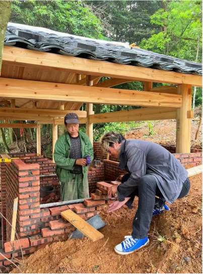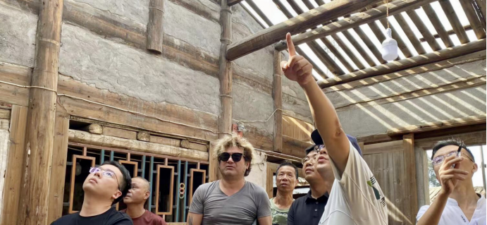 台湾建筑师团队与村民共同勘测古民居,传统夯土墙与现代设计图纸相映,展现“陪伴式”乡建乡创新模式。