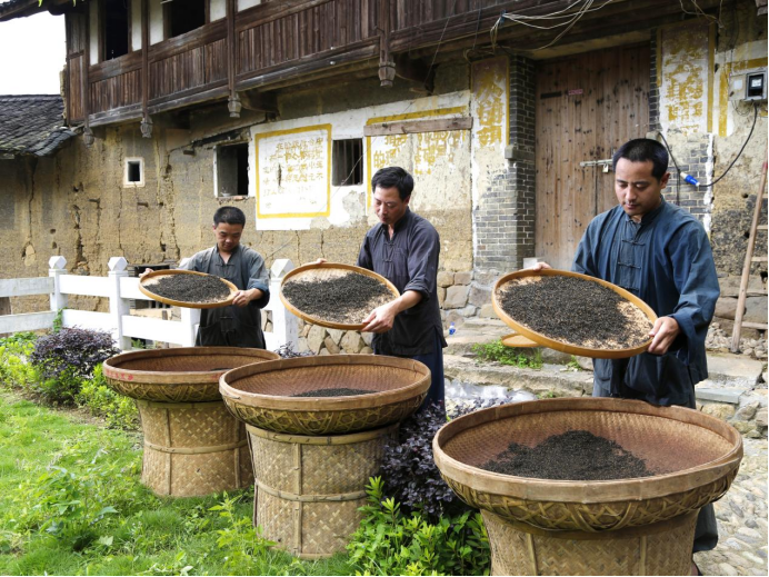 阳光下,国家级非遗传承人正在晾晒红茶鲜叶,复古木构工坊与连片茶园相映成趣,茶香氤氲中可见传统萎凋、揉捻工序现场。