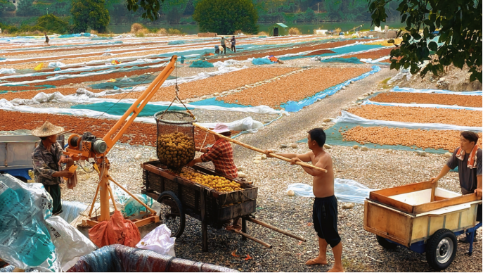 闲置古厝改造的李子加工体验馆内,游客亲手参与果干制作,墙面保留原建筑木梁结构,兼具实用性与历史感。