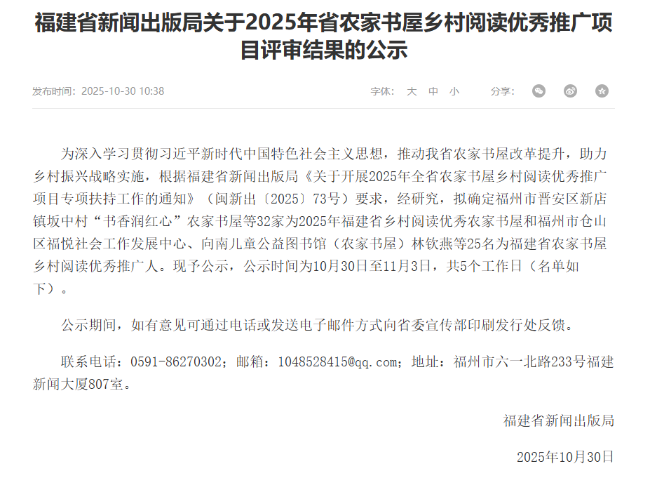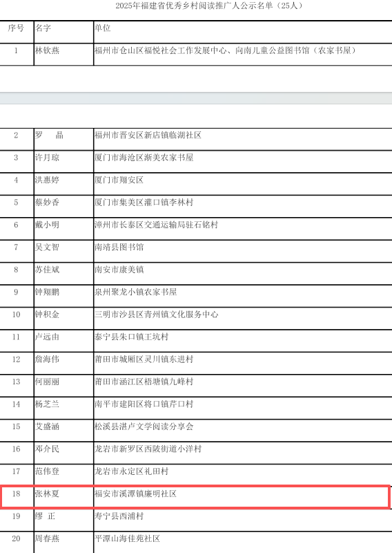 近日,福建省新闻出版局对2025年省农家书屋乡村阅读优秀推广项目评审结果进行公示,我市优秀阅读推广人张林夏(名单序号第18号)光荣入选“2025年福建省优秀乡村阅读推广人”。