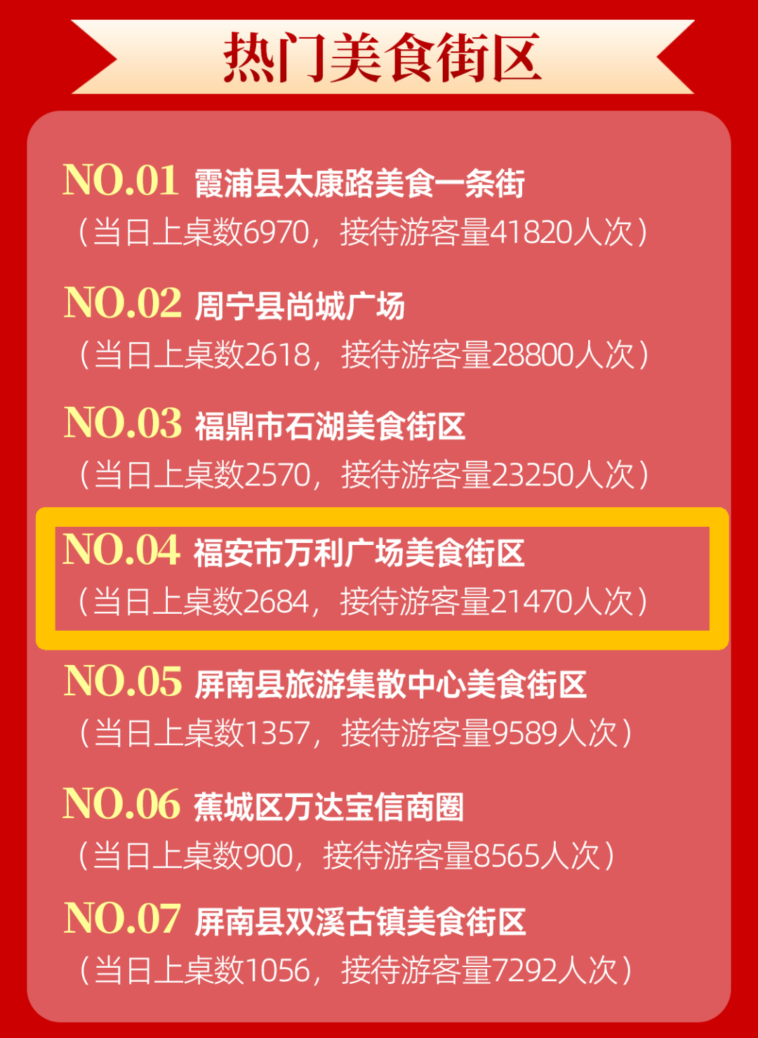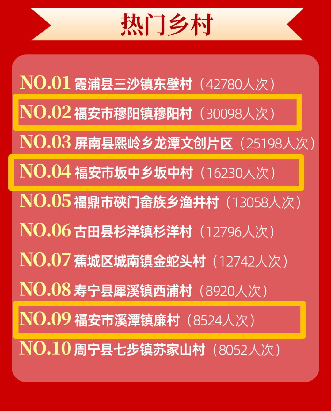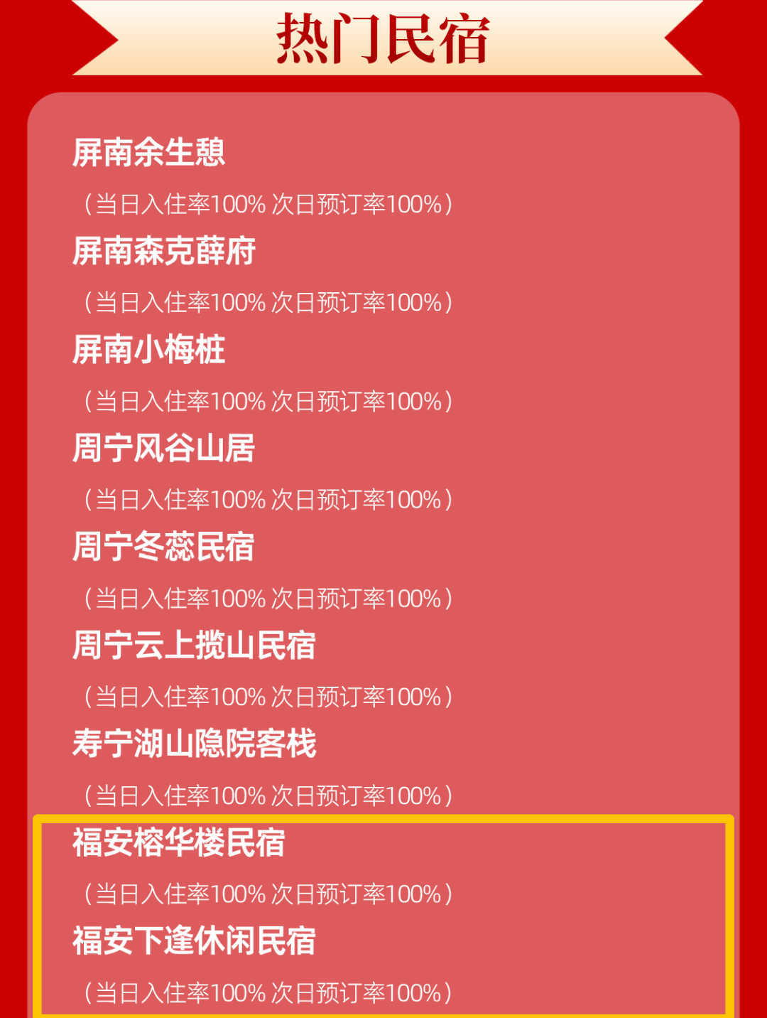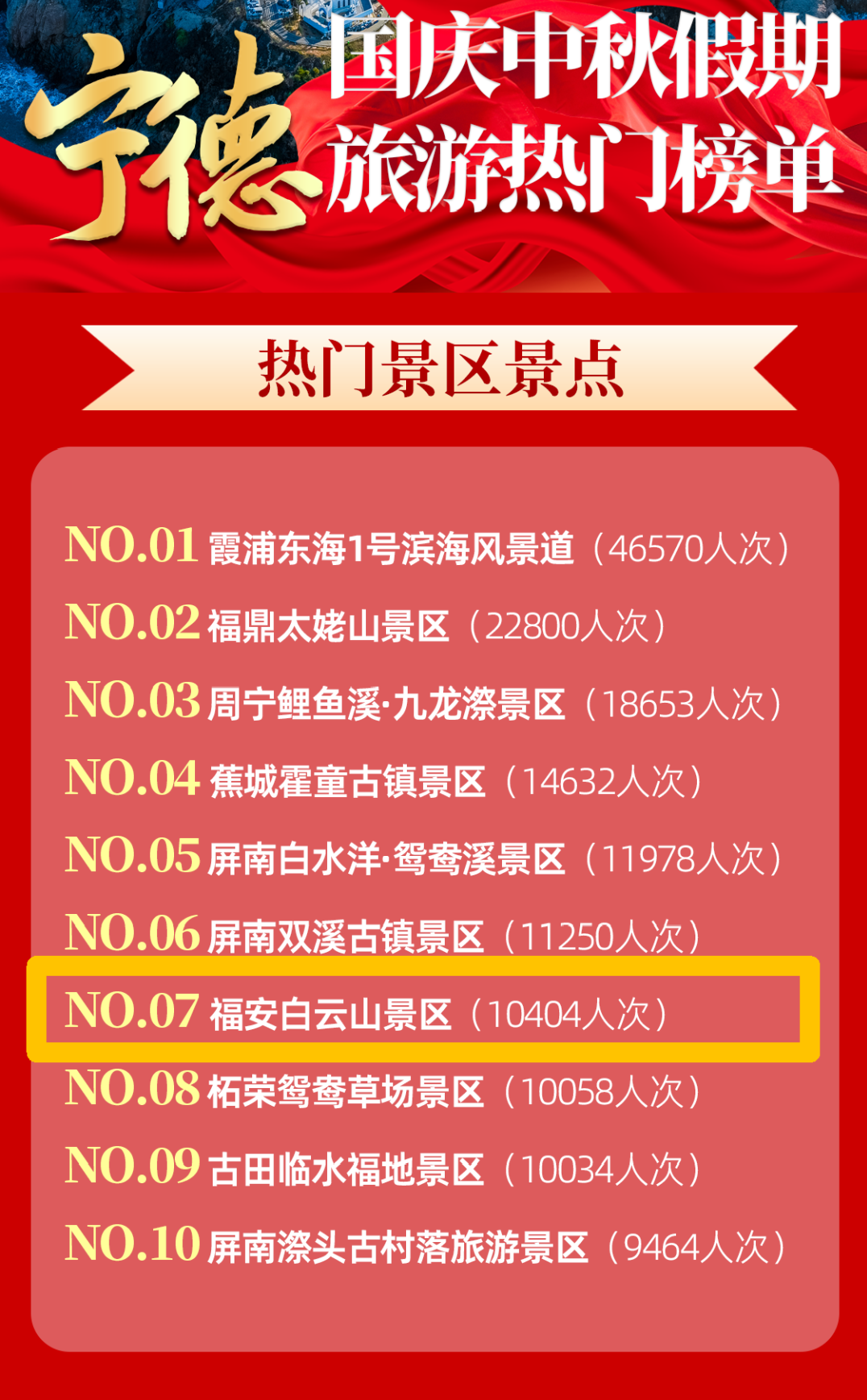 白云山景区入选宁德市国庆热门景区榜单,穆阳镇、坂中森林公园、廉村入选宁德市热门乡村榜单,万利广场美食街区入选宁德市热门美食街区榜单,榕华楼、下逢民宿入选宁德市热门民宿榜单。快和小编一起,感受一下国庆热闹的氛围吧!
