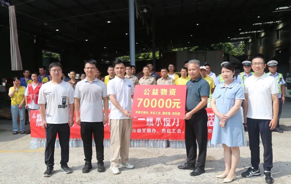 8月17 日,市委宣传部(文明办)、市总工会、团市委、妇联等单位联合组织开展“一瓶水接力”公益活动,为高温下坚守一线的执勤交警、快递小哥、环卫工人,路政施工人员等户外工作者送去矿泉水及消暑药品,感谢他们为我市经济社会发展付出的辛勤汗水与努力。