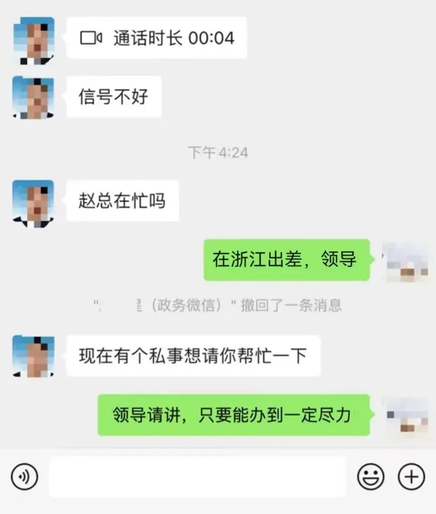 比如,在这个案例中,这名冒充领导的人忽然给受害人打来一个视频通话,通话时长只有几秒钟,这几秒里,受害人只能依稀看到画面中领导的样子,依稀听清楚是领导的声音。随后,视频就被挂断,骗子以信号不好为由,转而开始文字聊天。(这么做的原因,一方面是先入为主,展示自己,让受害人相信自己的身份。另一方面,直接断了后边转账时,受害人可能要求视频通话验证的后路。)