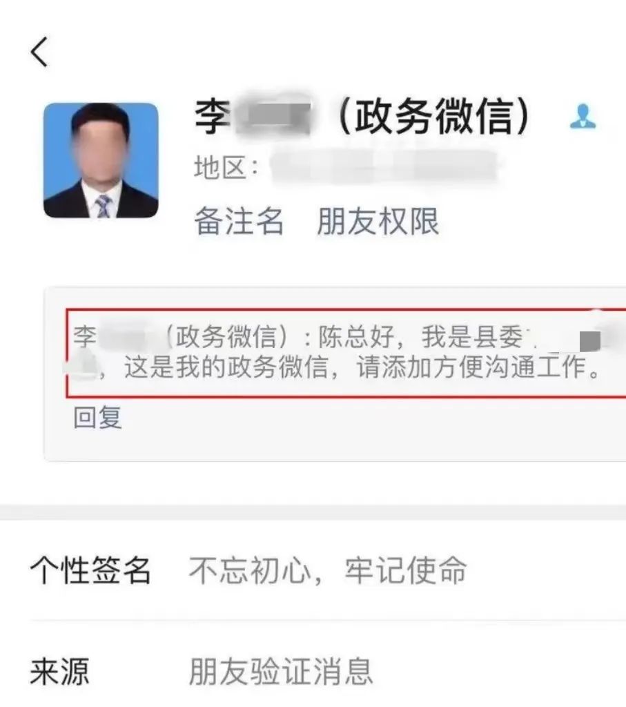 添加受害人,讲究一个精准配对,什么领域的领导,就添加什么领域的诈骗目标。(比如骗子冒充了教育局长,他就会去添加各个学校校长的社交账号。如果他冒充了县长、镇长,他就去网站上去查找这些县和镇里知名的企业。)