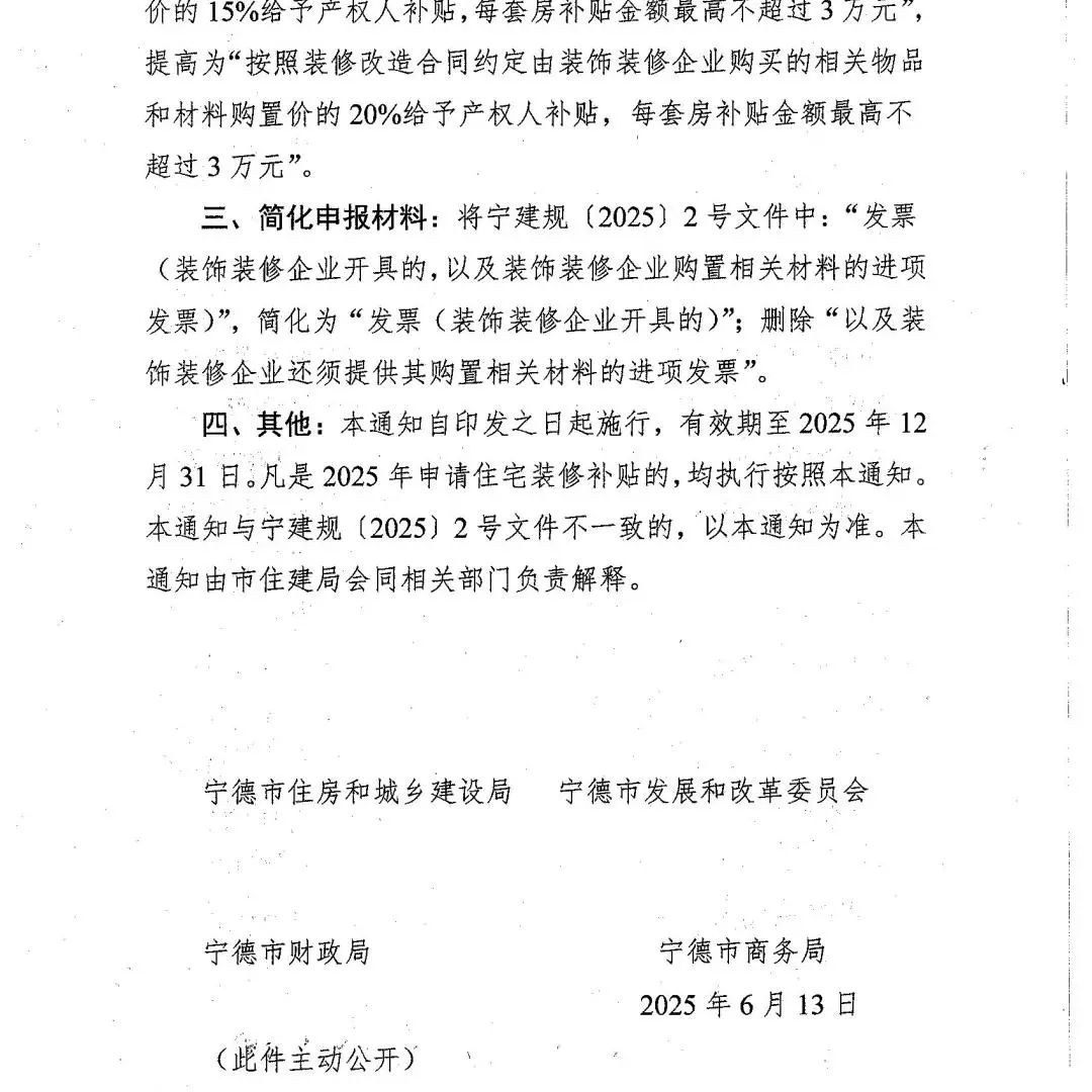 本通知自印发之日起施行,有效期至2025年12月31日。凡是2025年申请住宅装修补贴的,均执行按照本通知。本通知与宁建规〔2025〕2号文件不一致的,以本通知为准。本通知由宁德市住建局会同相关部门负责解释。