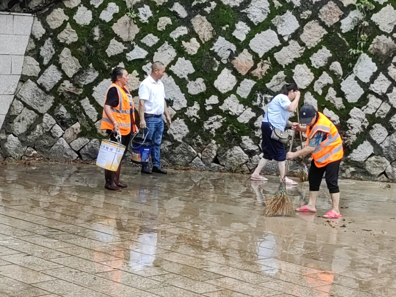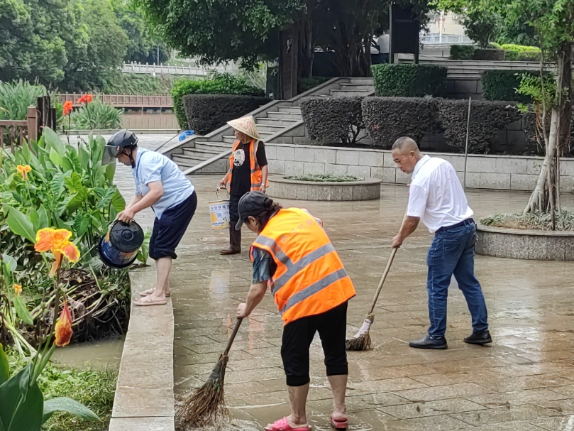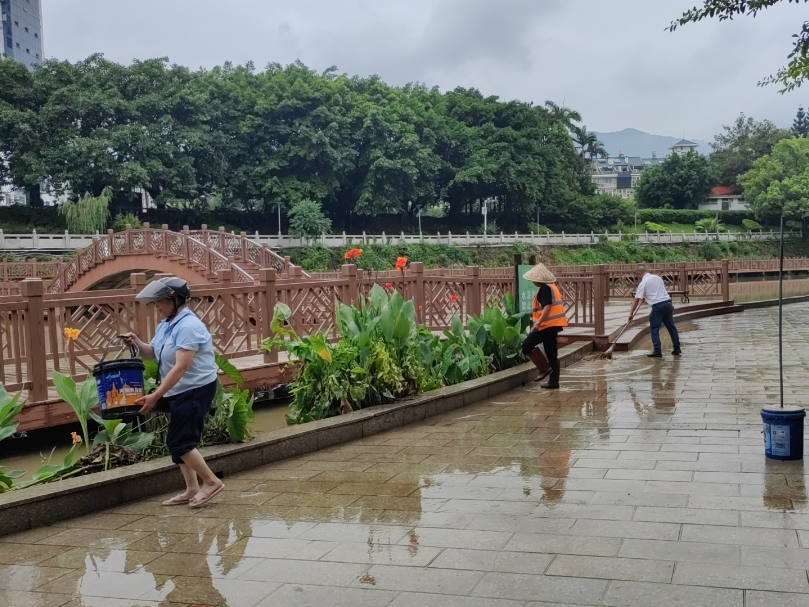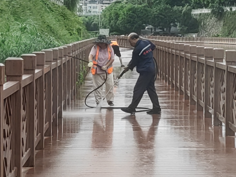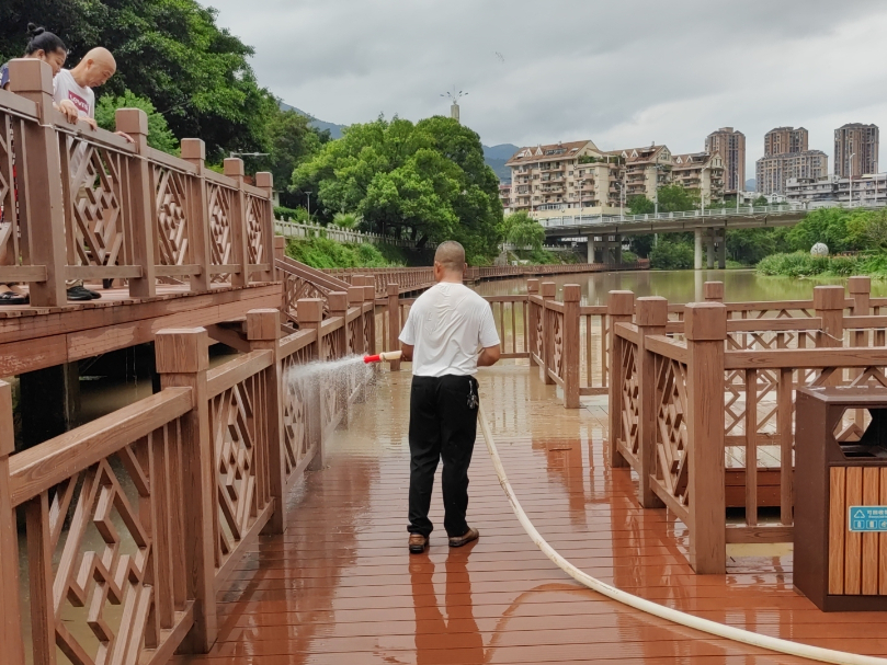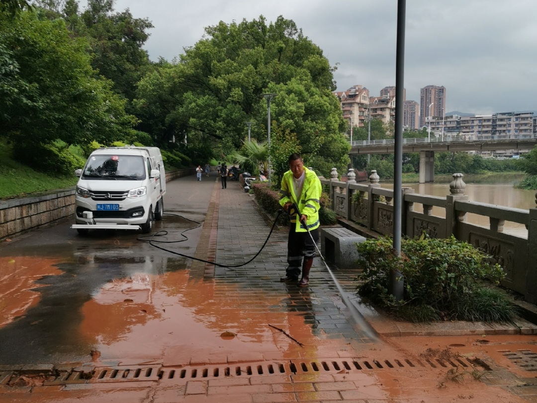 洪水刚退去,环卫外包单位——锦辉公司立即组织抽调10多名环卫工人利用抽水泵、三轮油污清洗车、洒水车等,分散多个工作组不断地对环龟湖栈道的淤泥进行冲洗。同时,安排工人清理拦河坝垃圾。该公司负责人林春生表示,淤泥要趁早冲洗,否则干了就更麻烦了。