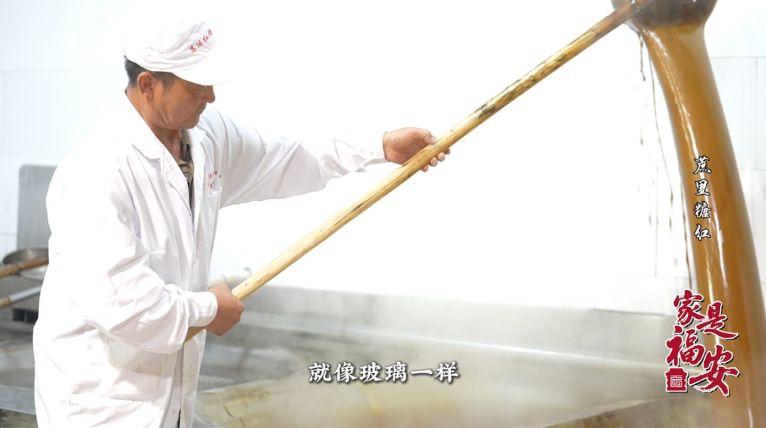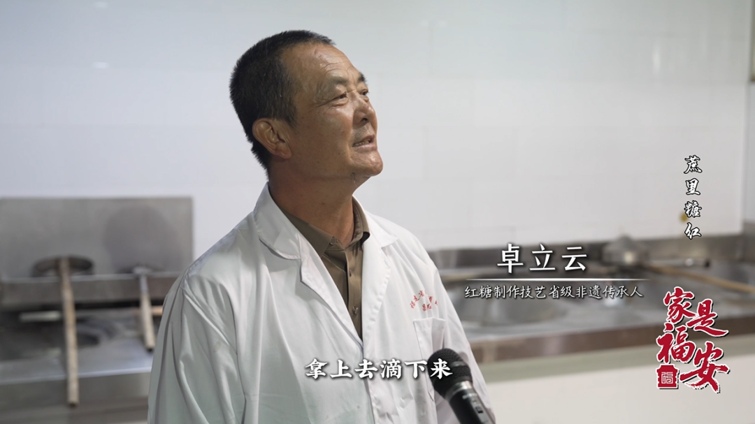 红糖制作技艺省级非遗传承人 卓立云:(摇瓢时)瓢拿起来,拿上去滴下来,就像玻璃一样,火候(糖)黏度要很高,用凉水把糖放在凉水里面捏进去,像冰块一样打到桶里面去,像铁一样声音就可以了。