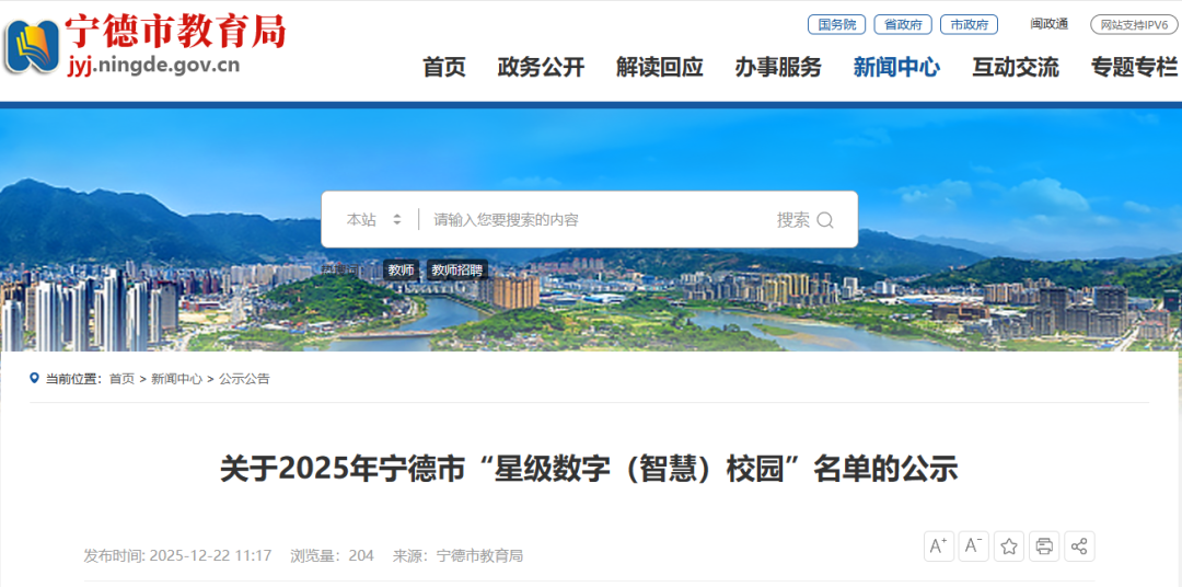 根据《宁德市教育局关于开展“星级数字(智慧)校园”申报工作的通知》(宁教直〔2025〕4号)要求,我局在学校自评、各地教育局推荐的基础上,组织专家于12月17日-20日通过现场听取汇报、实地考察等方式对69所申报学校进行评审,现将2025年宁德市“星级数字(智慧)校园”名单公示如下(见附件)。若有异议,请来电来信反映。