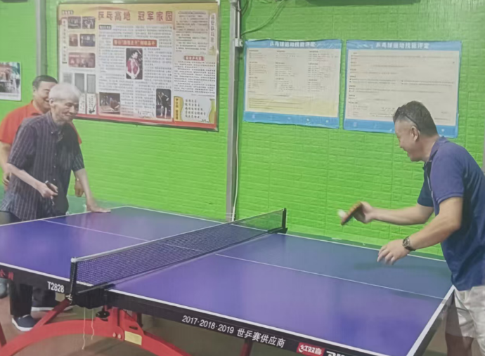 2021年10月4日,乒乓球世界冠军陈新华先生陪同九旬父亲在城南湖滨乒乓球馆练球。