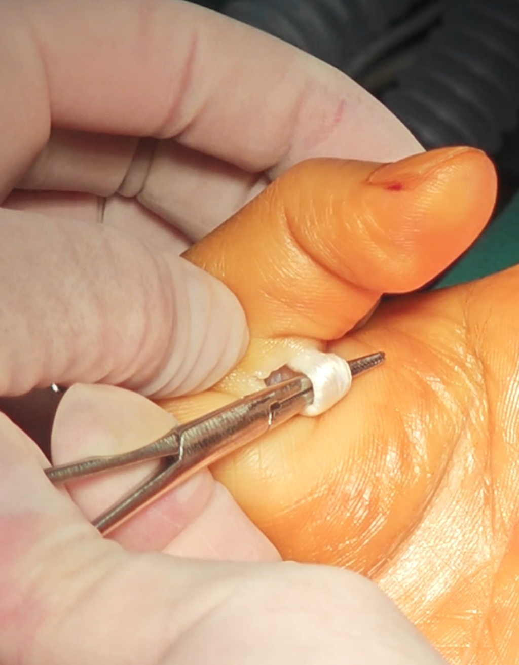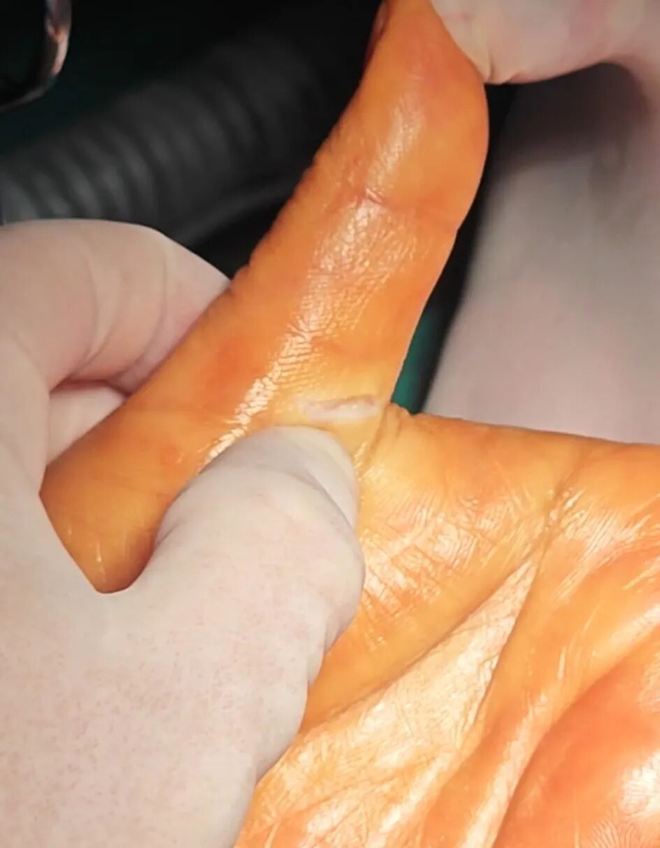 在充分沟通并完善术前准备后,陶女士接受了“双侧拇指腱鞘切开松解术”。手术在局部麻醉下进行,患者全程清醒。郭卫中主任医师在陶女士拇指根部的掌横纹处做了一个仅约7毫米的小切口。在精细解剖并严密保护重要神经、血管的前提下,医生迅速找到了已肥厚如“紧箍咒”的腱鞘。