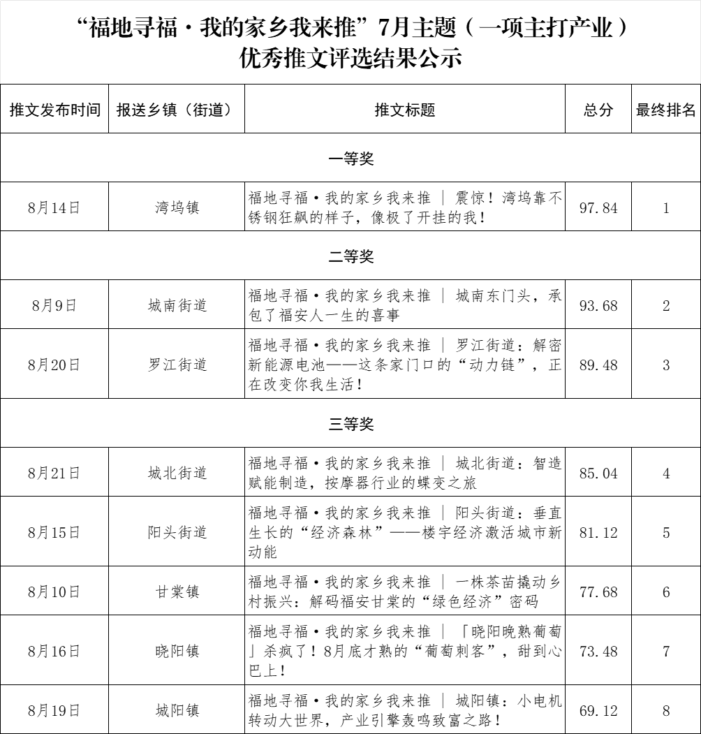 由中共福安市委宣传部、福安市民政局主办,福安市融媒体中心、福安市网信中心承办的首届“福地寻福·我的家乡我来推”优秀推文推介活动的7月主题(一项主打产业)展播阶段已结束,目前通过阅读量排名、专家评审的方式,分别决出了一、二、三等奖。