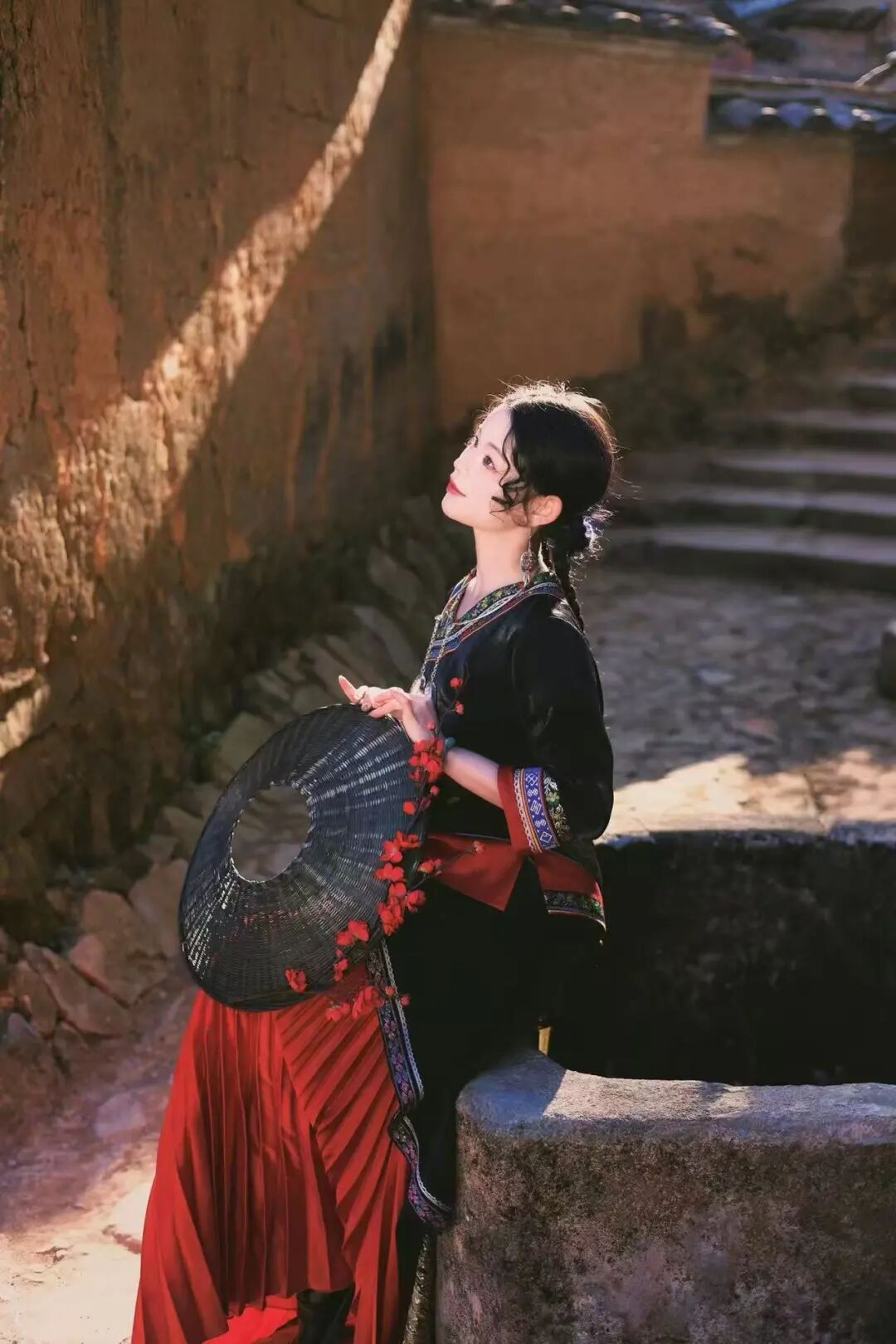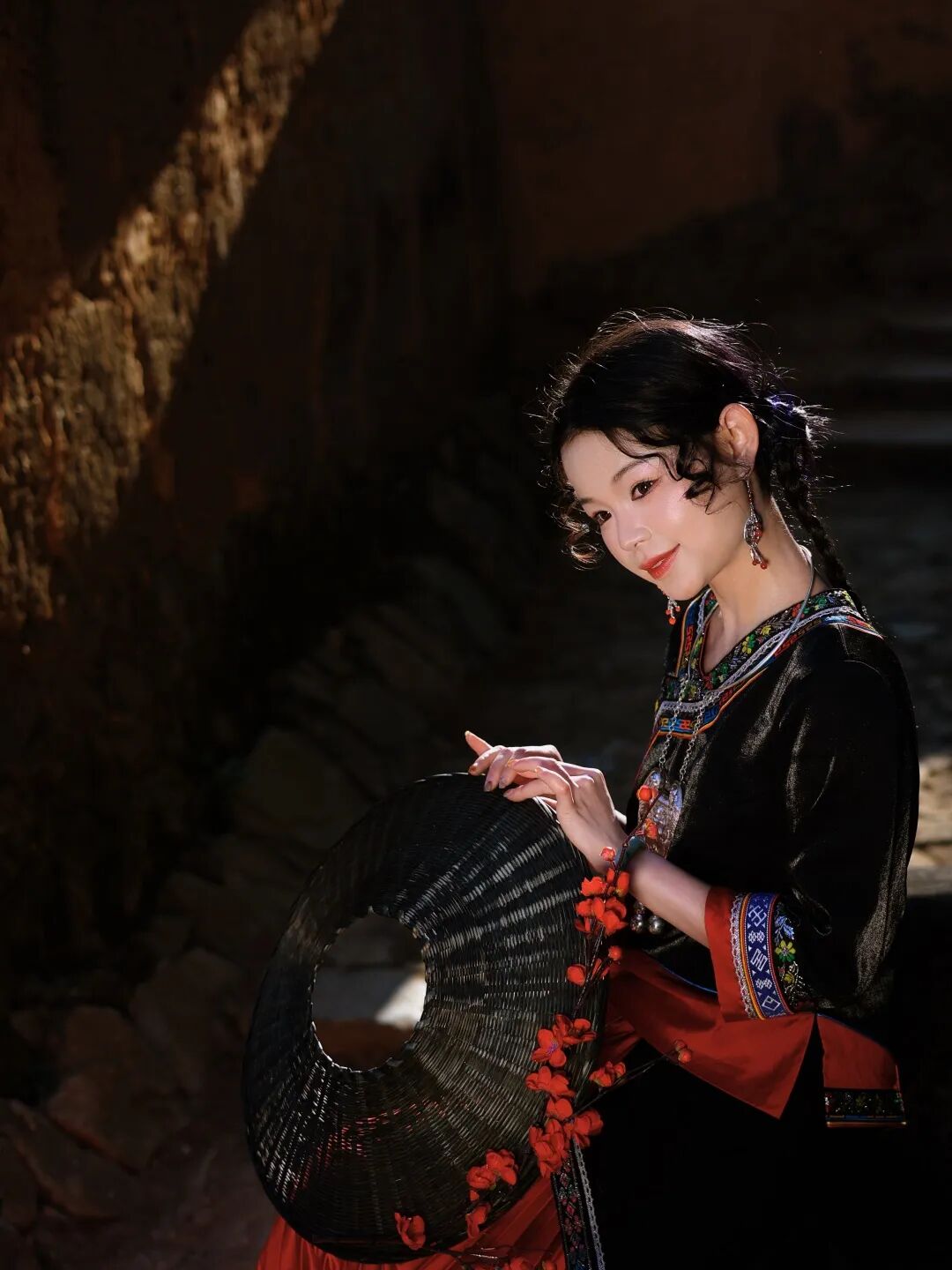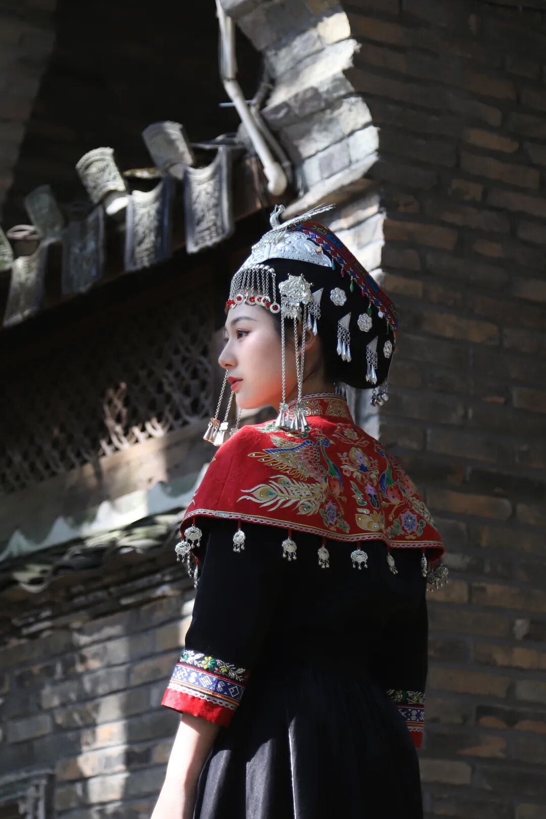 凤凰装的绚烂彩绣与老墙的斑驳质感形成强烈对比