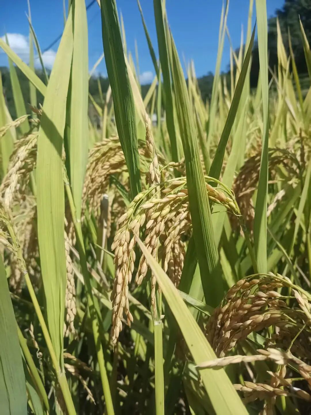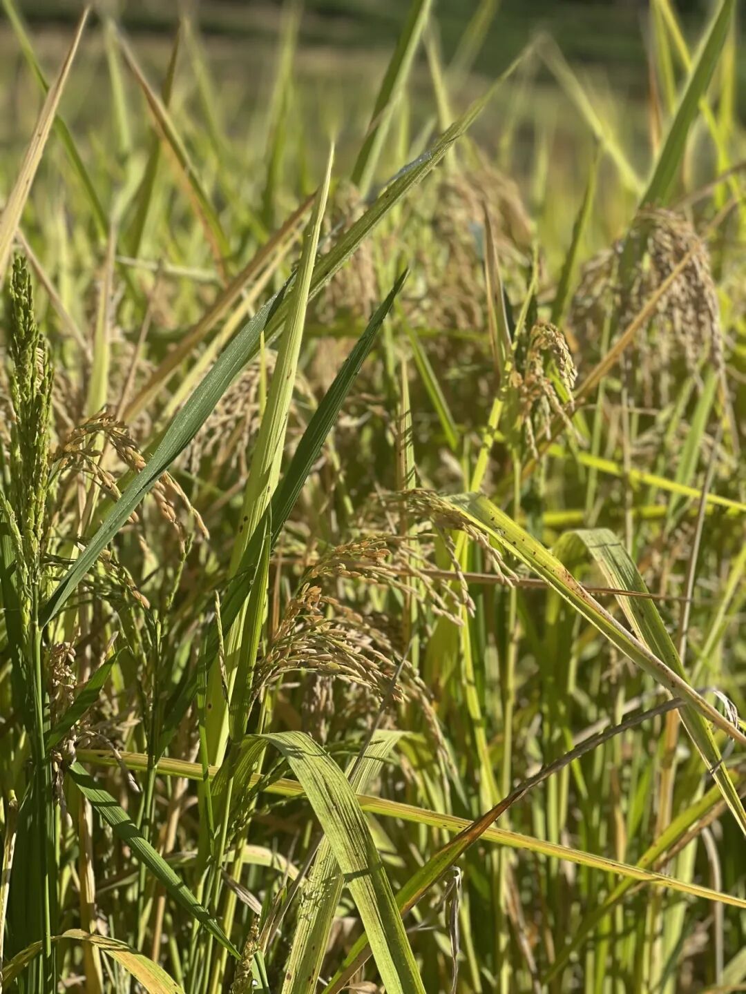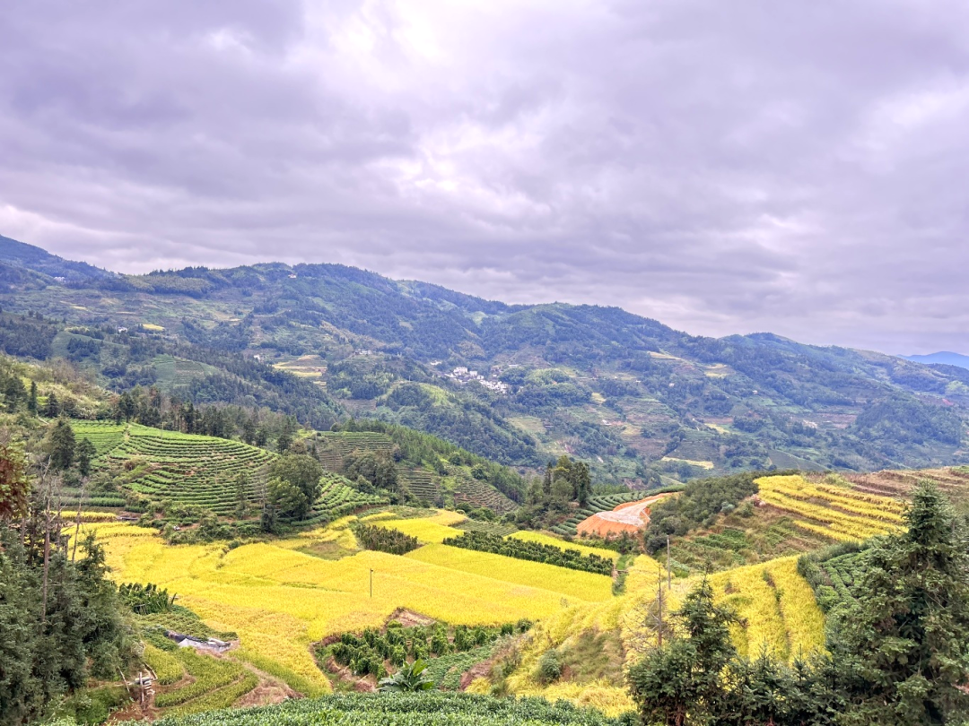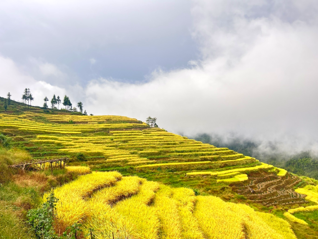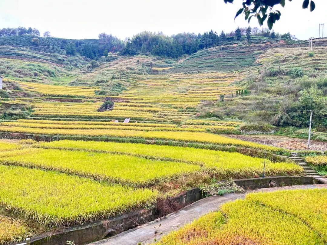 站在田垄高处眺望,梯田如金色的波浪,从脚下一直涌向远山。晨光初醒时,薄雾在金黄的稻穗间流淌,为这片灿烂蒙上柔和的轻纱。待到雾气散去,整片稻田在阳光下舒展开来——初熟的稻谷泛着柠檬般的浅黄,饱满的穗子沉淀出深沉的琥珀色,偶尔几株迟绿的稻秆点缀其间,像画师故意留下的笔触。